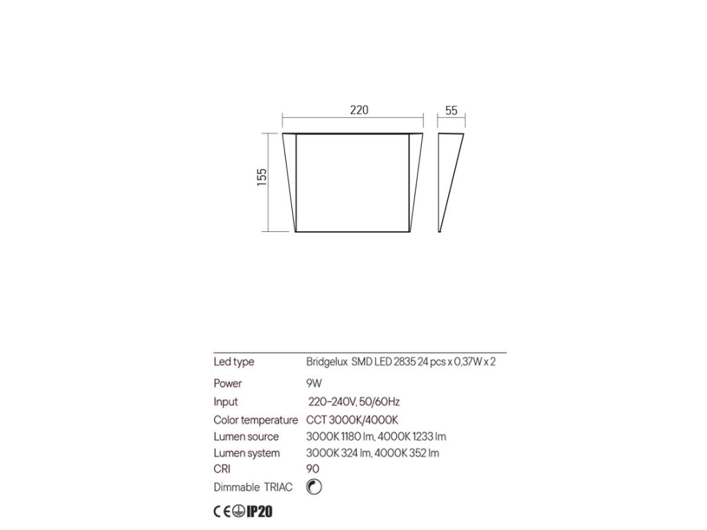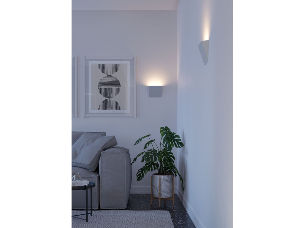 Nástenné svietidlo do interiéru s nepriamym svetlom, vybavené SMD LED, možnosť voľby teploty farby svetla 3000K alebo 4000K. Lakovaná konštrukcia z tlakovo liateho hliníka k dispozícii v dvoch farebných variantoch s difúzorom z priehľadného polykarbonátu.