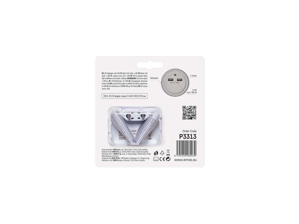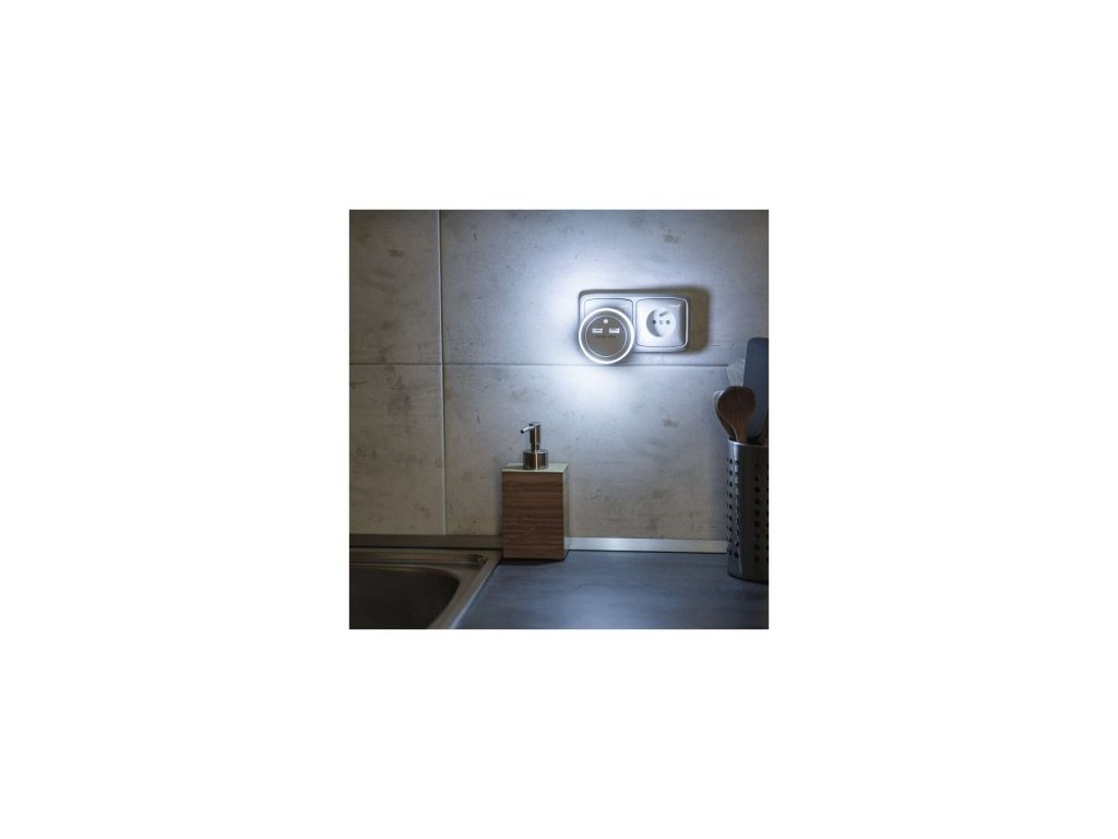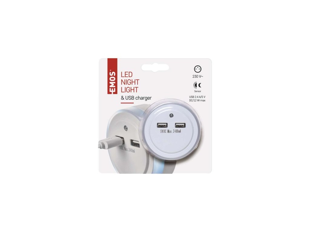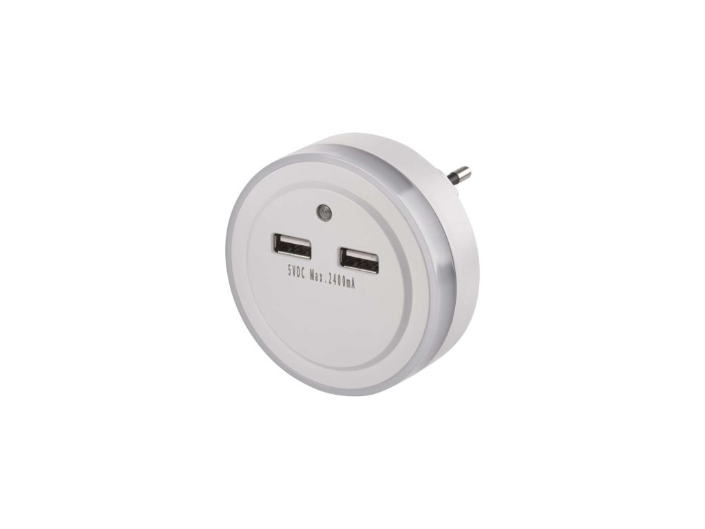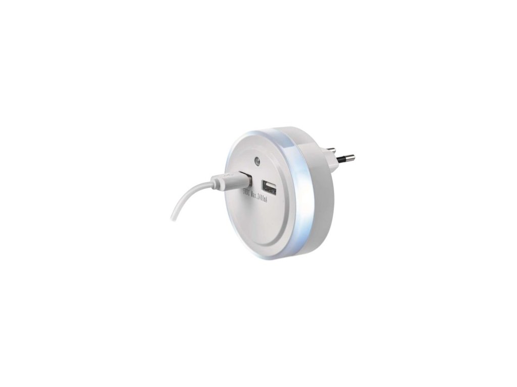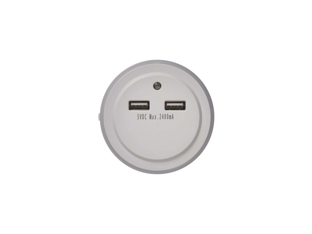 automatické zapnutie/vypnutie: áno|farba svetla: studené biele|časové oneskorenie: neuvádza sa|fotosenzor: áno|maximálny dosvit: 2 m|maximálny svetelný tok: 4 lm|max. výstup 1× USB: 5 V/2,4 A/12 W|max. výstup celkom: 5 V/2,4 A/12 W|napájanie: 230 V~/50 Hz, max. 0,3 W|natáčanie: ne|ochrana proti preťaženiu, prepätiu a skratu: áno|počet USB výstupov: 2|pohybové čidlo: ne|predajný obal: 1 ks, blister| 60 × 73 mm|vypínač: áno|zdroj svetla: 1× LED priemer 5 mmDodatočné parametre