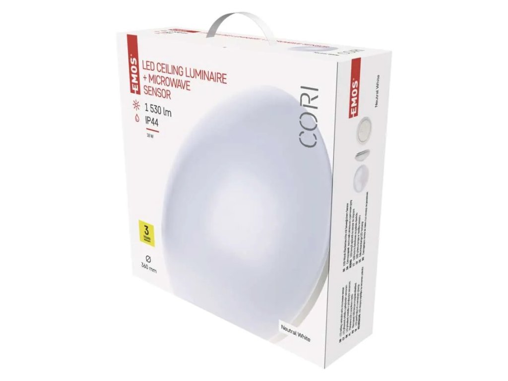 farba svetla: neutrálna biela|farba tela: biela|diaľkový ovládač: nie|do chodby a na schodisko: áno|do dielne a garáže: áno|do kancelárie: áno|do kúpeľne: áno|do kuchyne: áno|do obývačky, spálne a detskej izby: ne|dosah senzoru: 6 50/60 Hz|index podania farieb (CRI): Ra > 80|kategória: CLASSIC|krytie: IP44|materiál difúzora: plast (PMMA)|materiál LGP: neuvádza sa|materiál tela: oceľový plech|montážny otvor: neuvádza sa|možnosť stmievania: ne|náhrada 220–240 V|na záhradu a balkón: áno|pohybový senzor: MW|príkon: 18 W|predajný obal: 1 ks, krabica|prúd: 140 mA|rad: CORI|rozmer: priemer 360 × 105 mm|svetelná účinnosť: 85 lm3/ta| chromatickosti: 4 000 K|tvar: kruh|typ difúzora: mliečny|typ svietidla: klasické svietidlo|účiník: > 0,5|UGR<: neuvádza sa|uhol vyžarovania: 120°|umiestnenie: stropný/nástenné|výstupný prúd zo 3 rokov| LED|životnosť: 30 000 hodín|spôsob montáže: prisadenéDodatočné parametre