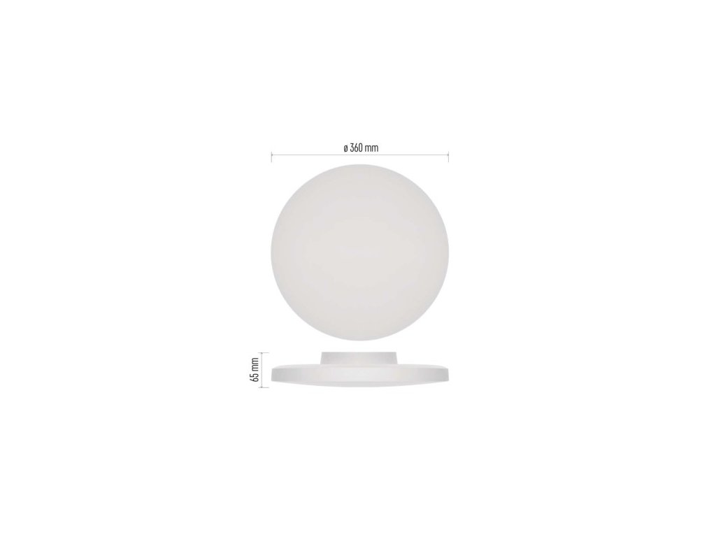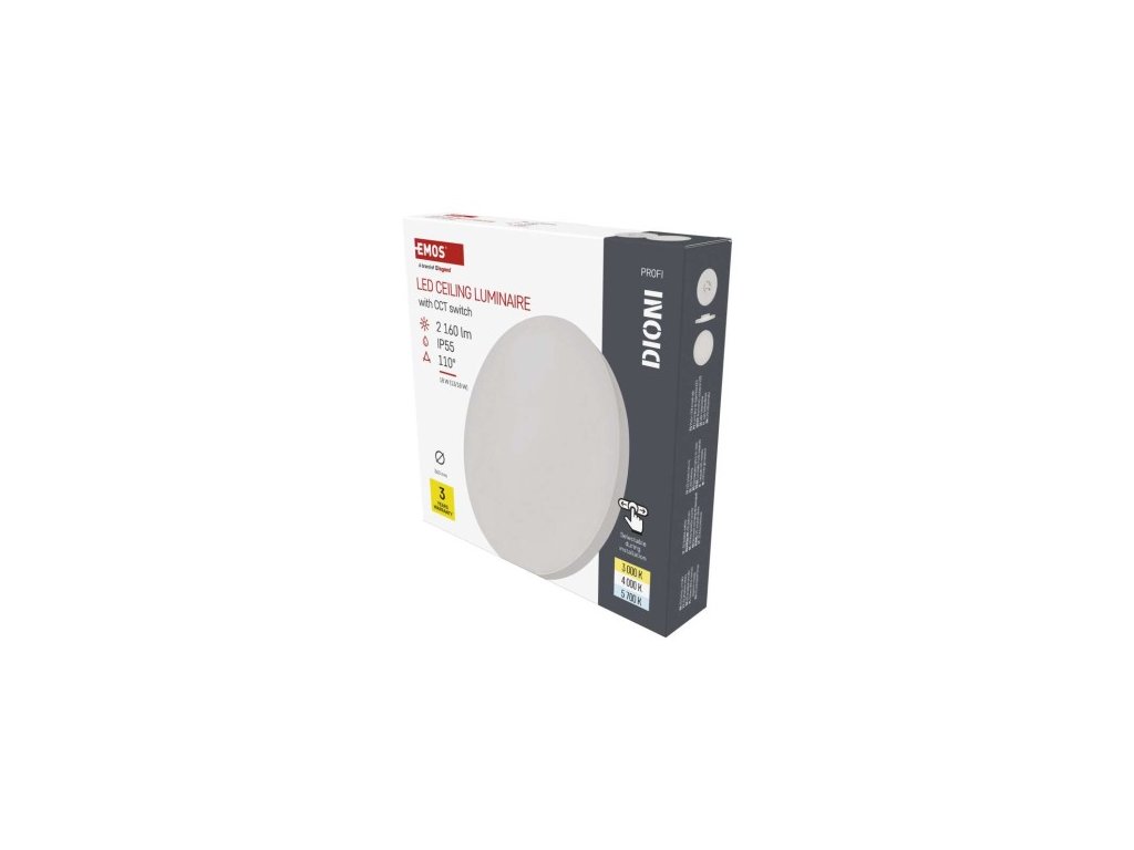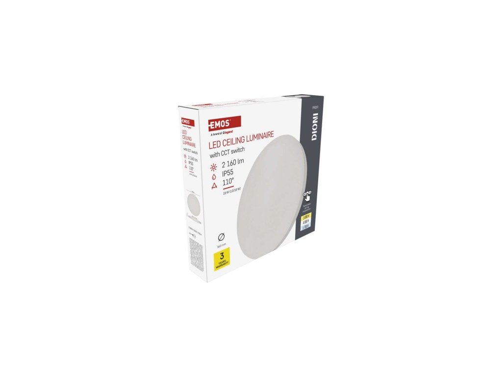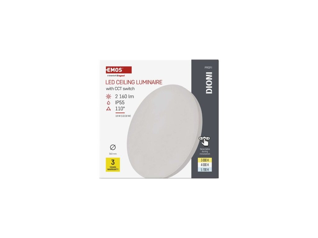 farba svetla: teplá/neutrálna/studená biela|farba tela: biela|diaľkový ovládač: ne|ďalšie funkcie: –|do chodby a na schodisko: áno|do dielne a garáže: ne|do kancelárie: áno|do kúpeľne: áno|do kuchyne: áno|do obývačky, spálne a detskej sa|flicker-free: nebliká|frekvencia: 50/60 Hz|index podania farieb (CRI): Ra > 80|jazyky aplikácie: –|kategória: PROFI|kompatibilita: –|krytie: IP55|materiál difúzora: plast|materiál LGP: neuvádza sa|materiál tela: plast žiarovku: 130 W|napätie: 220–240 V~|na záhradu a balkón: áno|notifikácia do mobilnej aplikácie: ne|obsah balenia: –|ovládanie hlasovými asistentmi: ne|podporované OS: –|pohybový senzor: ne|prenosová frekvencia: –|príkon: 18 W|predaj: –|prúd: 70 mA|rad: DIONI|rozmer: priemer 360 × 65 mm|svetelná účinnosť: 120 lm/W|svetelný tok: 2 160 lm|teplota chromatičnosti: 3 000/4 000/5 700 K|tvar: klasické svietidlo|účnik: > 0,8|UGR<: neuvádza sa|uhol vyžarovania: 110°|umiestnenie: stropný/nástenné|výstupný prúd zo zdroja: neuvádza sa|záručná doba: 3 roky|zdroj svetla: LED|životnosť: 30 000 hodín|spôsob montážeDodatočné parametre