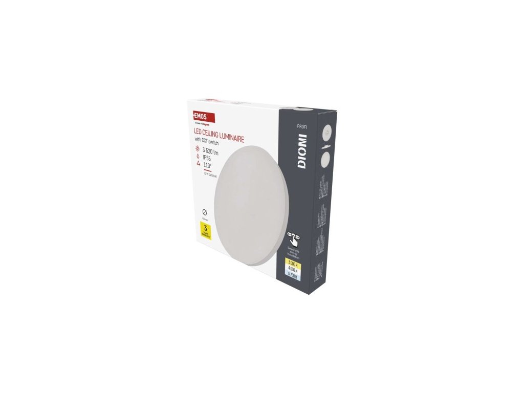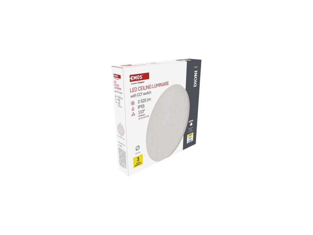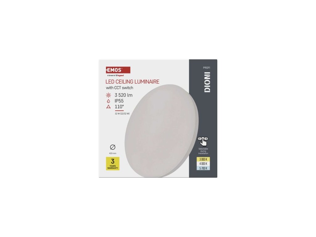 farba svetla: teplá/neutrálna/studená biela|farba tela: biela|diaľkový ovládač: ne|ďalšie funkcie: –|do chodby a na schodisko: áno|do dielne a garáže: ne|do kancelárie: áno|do kúpeľne: áno|do kuchyne: áno|do obývačky, spálne a detskej sa|flicker-free: nebliká|frekvencia: 50/60 Hz|index podania farieb (CRI): Ra > 80|jazyky aplikácie: –|kategória: PROFI|kompatibilita: –|krytie: IP55|materiál difúzora: plast|materiál LGP: neuvádza sa|materiál tela: plast žiarovku: 200 W|napätie: 220–240 V~|na záhradu a balkón: áno|notifikácia do mobilnej aplikácie: ne|obsah balenia: –|ovládanie hlasovými asistentmi: ne|podporované OS: –|pohybový senzor: ne|prenosová frekvencia: –|príkon: 32 W|predaj: –|prúd: 123 mA|rad: DIONI|rozmer: priemer 410 × 65 mm|svetelná účinnosť: 110 lm/W|svetelný tok: 3 520 lm|teplota chromatickosti: 3 000/4 000/5 700 K|tvar klasické svietidlo|účiník: > 0,9|UGR<: neuvádza sa|uhol vyžarovania: 110°|umiestnenie: stropný/nástenné|výstupný prúd zo zdroja: neuvádza sa|záručná doba: 3 roky|zdroj svetla: LED|životnosť: 30 000 hodín|spôsob montážeDodatočné parametre