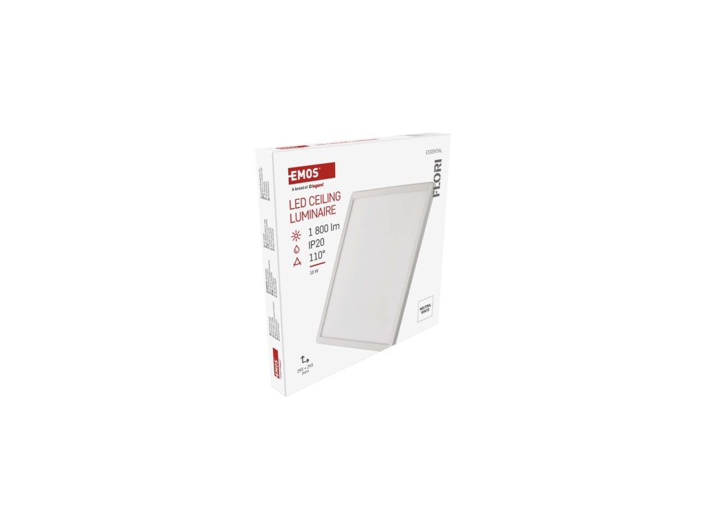 farba svetla: neutrálna biela|farba tela: biela|diaľkový ovládač: ne|do chodby a na schodisko: áno|do dielne a garáže: ne|do kancelárie: ne|do kúpeľne: ne|do kuchyne: áno|do obývačky, spálne a detskej izby: áno|dosah senzora: neuvádza sa| 50/60 Hz|index podania farieb (CRI): Ra > 80|kategória: ESSENTIAL|krytie: IP20|materiál difúzora: plast|materiál LGP: neuvádza sa|materiál tela: plast|montážny otvor: neuvádza sa|možnosť stmievania: ne|náhrada za žiarovku2~|2 záhradu a balkón: ne|pohybový senzor: ne|príkon: 18 W|predajný obal: 1 ks, krabica|prúd: 134 mA|rada: FLORI|rozmer: 293 × 293 × 29 mm|svetelná účinnosť: 100 lm/W|svetelný tok: 100 lm/W| 000 K|tvar: štvorec|typ difúzora: mliečny|typ svietidla: klasické svietidlo|účiník: > 0,5|UGR<: neuvádza sa|uhol vyžarovania: 110°|umiestnenie: stropný/nástenné|výstupný prúd zo zdroja: neuvádza sa|záručná doba:| 000 hodín|spôsob montáže: prisadenéDodatočné parametre