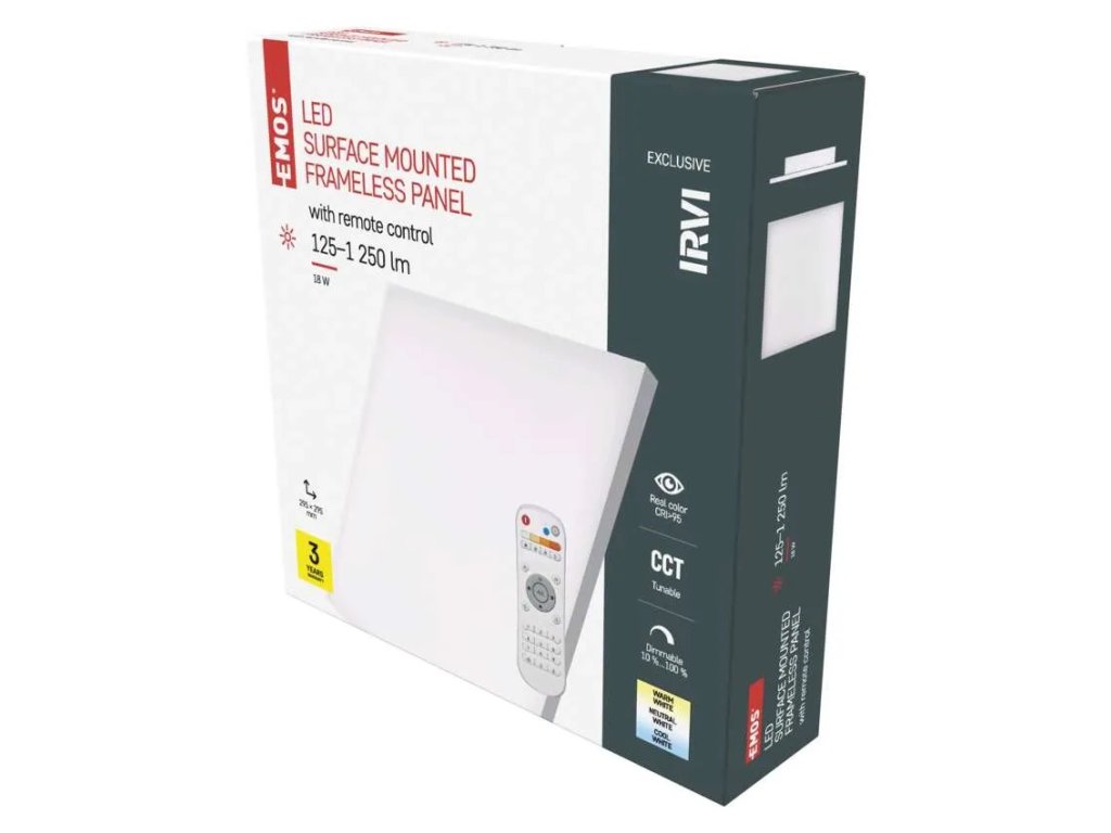 farba svetla: teplá biela–studená biela|farba tela: biela|diaľkový ovládač: áno|do chodby a na schodisko: ne|do dielne a garáže: ne|do kancelárie: áno|do kúpeľne: ne|do kuchyne: áno|do obývačky, spálne a detskej izby: áno|dosah áno|frekvencia: 50/60 Hz|index podania farieb (CRI): Ra > 95|kategória: EXCLUSIVE|krytie: IP20|materiál difúzora: plast (PC)|materiál LGP: PS|materiál tela: hliník|montážny otvor: neuvádza sa|možnosť stmievania: sa 220–240 V|na záhradu a balkón: ne|pohybový senzor: ne|príkon: 18 W|predajný obal: 1 ks, krabica|prúd: 95 mA|rad: IRVI|rozmer: 295 × 295 × 61 mm|svetelná účinnosť: 70 lm/W lm|teplota chromatickosti: 2 700–6 000 K|tvar: štvorec|typ difúzora: mliečny|typ svietidla: klasické svietidlo|účinník: > 0,9|UGR<: 22|uhol vyžarovania: 115°|umiestnenie: stropný|výstupný roky|zdroj svetla: LED|životnosť: 30 000 hodín|spôsob montáže: prisadenéDodatočné parametre
