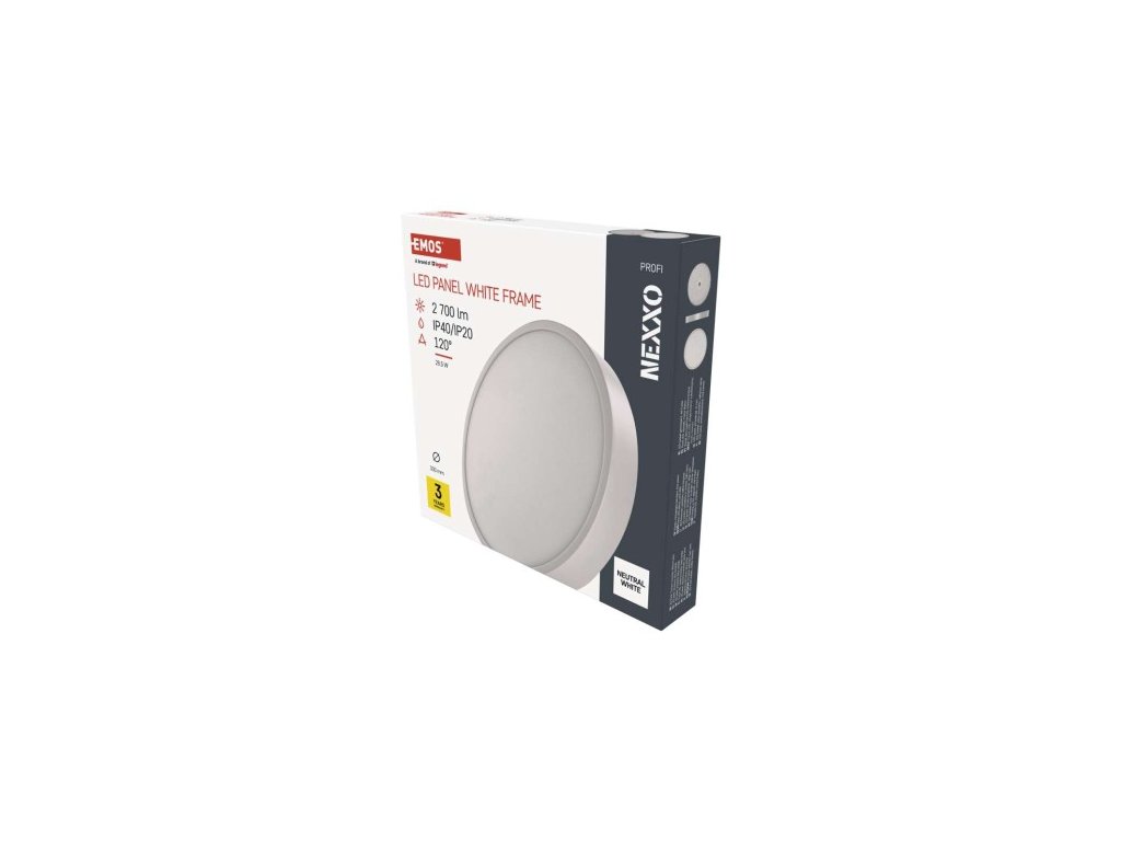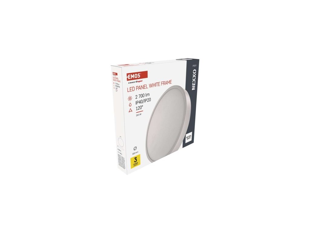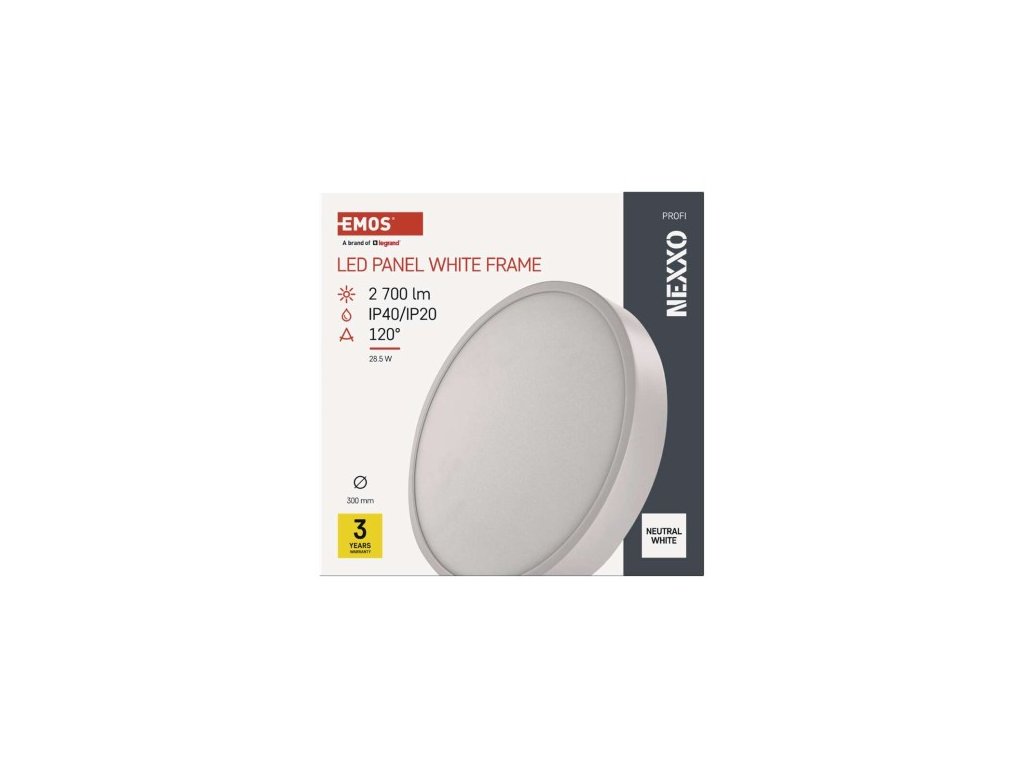 farba svetla: neutrálna biela|farba tela: biela|diaľkový ovládač: ne|do chodby a na schodisko: áno|do dielne a garáže: ne|do kancelárie: áno|do kúpeľne: ne|do kuchyne: áno|do obývačky, spálne a detskej izby: áno|dosah senzora: nemá senzor| 50/60 Hz|index podania farieb (CRI): Ra > 80|kategória: PROFI|krytie: IP40/IP20|materiál difúzora: plast (PMMA)|materiál LGP: PMMA|materiál tela: oceľový plech|montážny otvor: neuvádza sa|možnosť stmievania: ne|náhrada 220–240 V|na záhradu a balkón: ne|pohybový senzor: ne|príkon: 28,5 W|predajný obal: 1 ks, papierová krabička|prúd: 700 mA|rada: NEXXO|rozmer: priemer 300 × 42 mm|svetelná účinnosť: 90 lm lm|teplota chromatickosti: 4 000 K|tvar: kruh|typ difúzora: mliečny|typ svietidla: klasické svietidlo|účnik: > 0,9|UGR<: neuvádza sa|uhol vyžarovania: 120°|umiestnenie: stropné/nástenné|zástupné | roky|zdroj svetla: LED|životnosť: 30 000 hodín|spôsob montáže: prisadenéDodatočné parametre