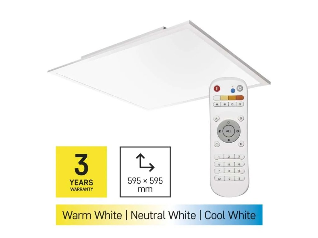 farba svetla: teplá biela–studená biela|farba tela: biela|diaľkový ovládač: áno|do chodby a na schodisko: ne|do dielne a garáže: ne|do kancelárie: áno|do kúpeľne: ne|do kuchyne: áno|do obývačky, spálne a detskej izby: áno|dosah áno|frekvencia: 50/60 Hz|index podania farieb (CRI): Ra > 80|kategória: EXCLUSIVE|krytie: IP20|materiál difúzora: plast (PC)|materiál LGP: PS|materiál tela: hliník|montážny otvor: neuvádza sa|možnosť stmievania: sa 220–240 V|na záhradu a balkón: ne|pohybový senzor: ne|príkon: 40 W|predajný obal: 1 ks, krabica|prúd: 170 mA|rad: RIVI|rozmer: 595 × 595 × 52 mm|svetelná účinnosť: 95 lm/08 lm|teplota chromatickosti: 2 700–6 000 K|tvar: štvorec|typ difúzora: mliečny|typ svietidla: klasické svietidlo|účinník: > 0,9|UGR<: 22|uhol vyžarovania: 115°|umiestnenie: stropný|výstupný roky|zdroj svetla: LED|životnosť: 30 000 hodín|spôsob montáže: prisadenéDodatočné parametre