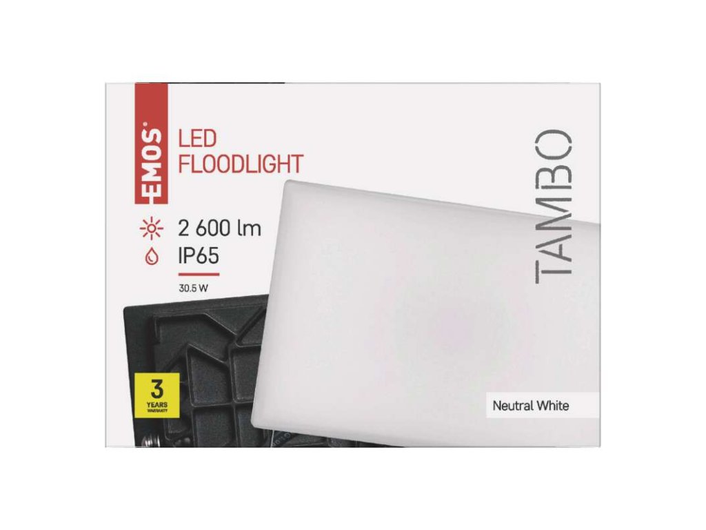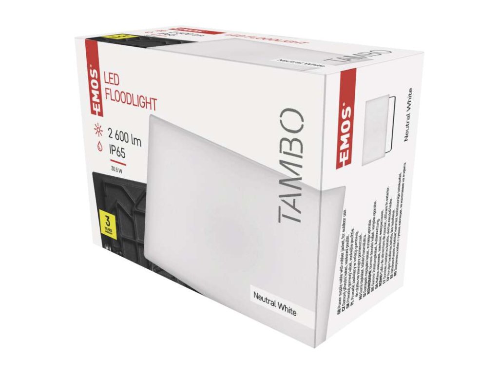 Reflektory TAMBO sú tenké iba 55 milimetrov a pritom nahradia až 430W žiarovku. Vďaka mliečnemu difúzoru poskytujú príjemne rozptýlené svetlo. Tento ultra tenký reflektor si navyše môžete zaobstarať aj s pohybovým čidlom. Vďaka vysokému stupňu krytia IP65 sú reflektory TAMBO spoľahlivo osvetľujú vnútorné aj vonkajšie priestory v teplotách od -20 do +40 °C. Životnosť svietidla je 25 tisíc hodín. Uhol osvetlenia je 120° a poskytuje svetelný tok až 4000 lm.