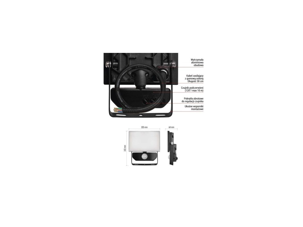 akumulátor: neuvádza sa|farba: čierna|farba svetla: neutrálna biela|dĺžka prívodného kábla: 30 cm|doba svietenia na AKU: neuvádza sa|dosah PIR senzora: 10 m|energetická trieda použitého svetelného zdroja: F|flicker-free: áno|frekvencia: 50/6: 80|kategória: CLASSIC|krytie: IP54|materiál difúzora: plast (PC)|materiál prívodného kábla: guma|materiál tela: hliník|napájanie: zo siete|napätie: 220–240 V~|PIR senzor: áno|počet priechodných zásuviek: 0|použitie: 1 ks, krabica|prúd: 55 mA|rad: TAMBO|rozmer: 105 × 143 × 64 mm|rozsah pracovnej teploty: -20 °C až +40 °C|stmievanie: ne|stupeň ochrany proti mechanickým nárazom: IK06|svetelná účinnosť: 100 lm/0 lm|teplota chromatickosti: 4 000 K|typ prívodného kábla: neuvádza sa|typ priechodných zásuviek: neuvádza sa|typ stmievanie: –|účnik: > 0,9|uhol vyžarovania: 120°|záručná doba: 3 roky|zdroj svetla:2| balenie: nieDodatočné parametre