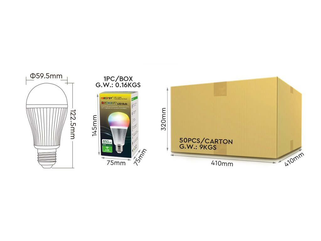 LED stmievateľná žiarovka E27, jas + CCT, 9W, 2.4GHz, FUT019