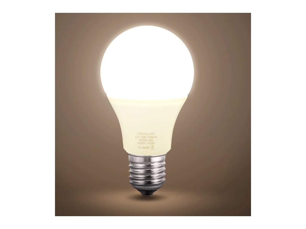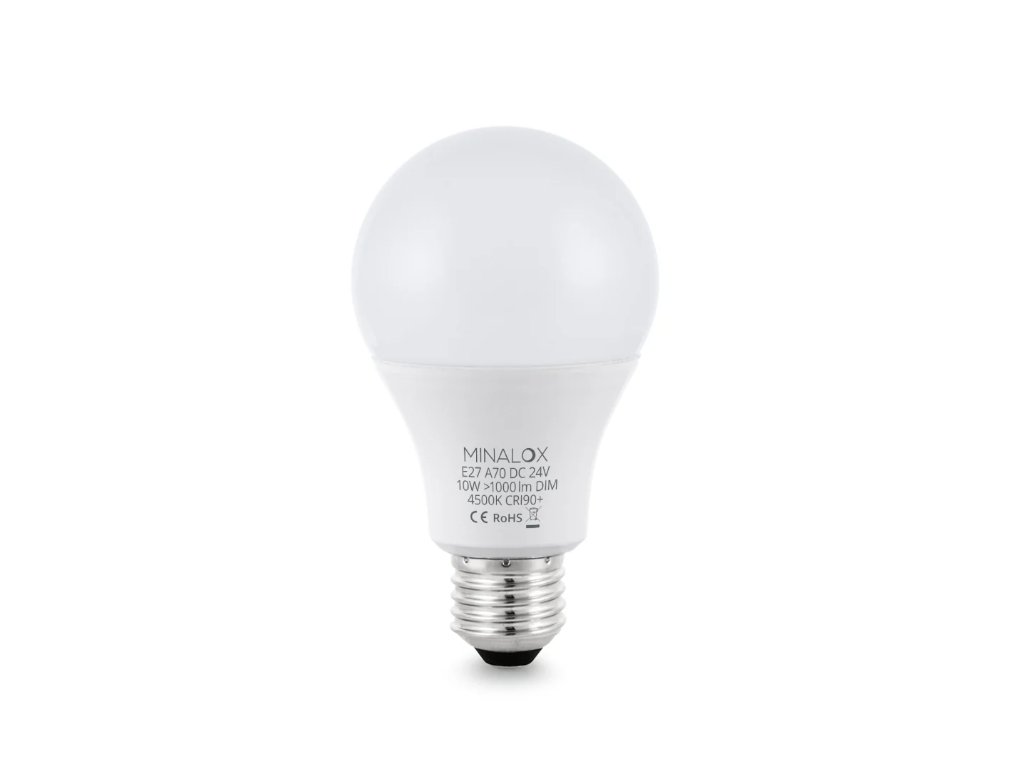 LED stmievateľná žiarovka Minalox A70 E27, 10W, 24V, 4500K