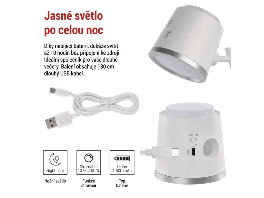 farba: biela|farba svetla: teplá/neutrálna/studená biela|činiteľ starnutia: 0,96|čip LED: SMD|dĺžka prívodného kábla: 1,3 m|energetická trieda: neuvádza sa|energetická trieda (od 1.9.2021): neuvádza sa|index podania farieb áno|krytie: IP20|materiál: hliník/plast|max. výkon: 6 W|napájací zdroj: USB|napájací zdroj súčasťou balenia: áno|napätie: 3,7 V|obsah ortuti: neuvádza sa|pätica (uchytenie žiarovky): neuvádza sa|počet LED: neuvádza sa|počet spínacích 1 ks, krabica|rozmer: 250 × 100 mm|rýchlosť nábehu na 100 %: neuvádza sa|stmievanie: áno|svetelný tok: 300 lm|teplota chromatickosti: 3 000/4 000/6 500 K|typ napájania: áno|životnosť: neuvádza sa