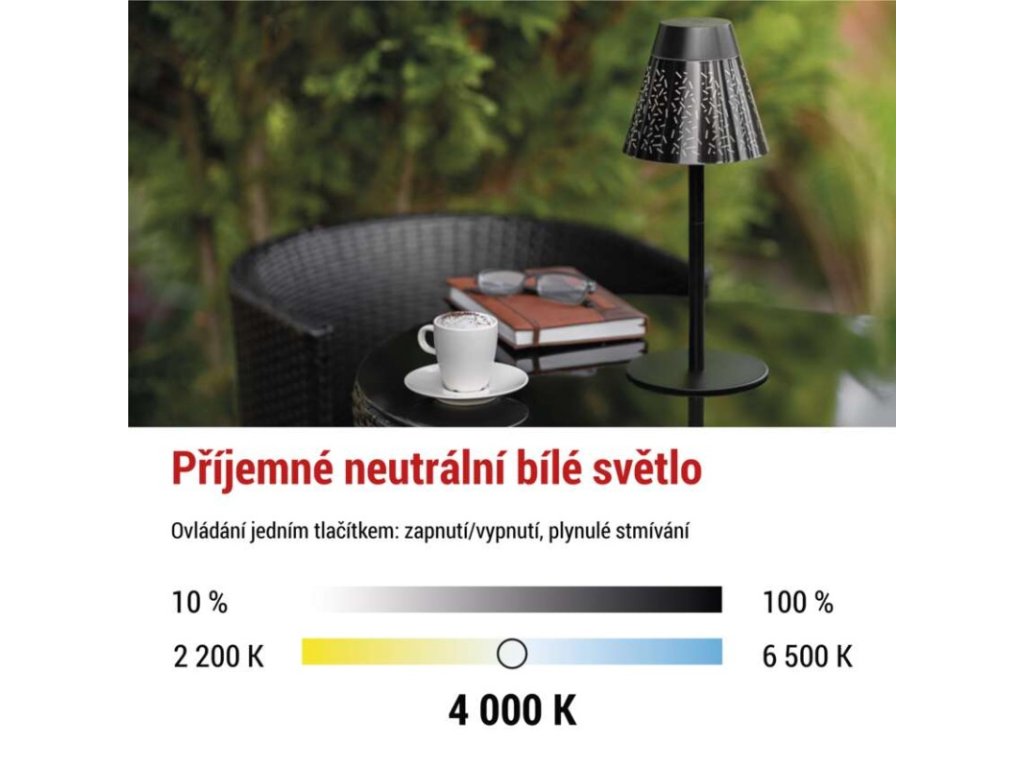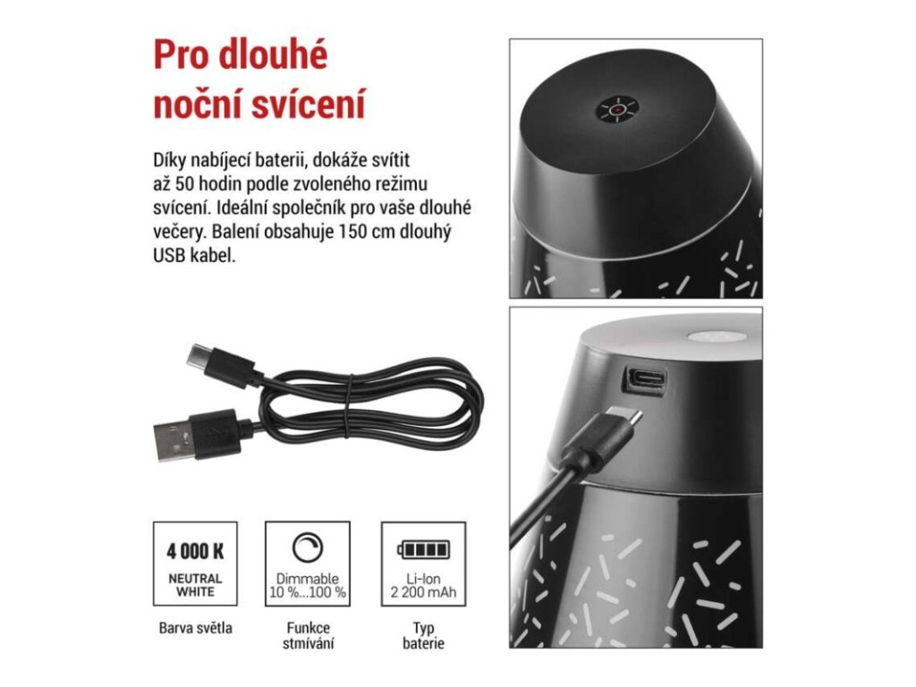 farba: čierna|farba svetla: neutrálna biela|činiteľ starnutia: 0,96|čip LED: SMD|dĺžka prívodného kábla: 1,5 m|energetická trieda: neuvádza sa|energetická trieda (od 1.9.2021): neuvádza sa|index podania farieb (CRI): Ra >80| IP44|materiál: plast + kov|max. výkon: 2,5 W|napájací zdroj: USB|napájací zdroj súčasťou balenia: áno|napätie: 5 V|obsah ortuti: neuvádza sa|pätica (uchytenie žiarovky): neuvádza sa|počet LED: neuvádza sa|počet spínacích cyklov: neuvádza sa|príkon: 4,2 W|predajný obal 130 mm|rýchlosť nábehu na 100 %: neuvádza sa|stmievanie: áno|svetelný tok: 200 lm|teplota chromatickosti: 4 000 K|typ napájania: USB|účnik: neuvádza sa|USB port: áno|životnosť: neuvádza saDodatočné parametre