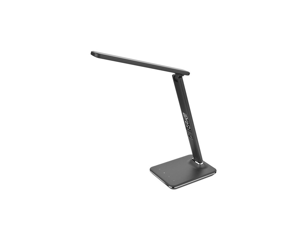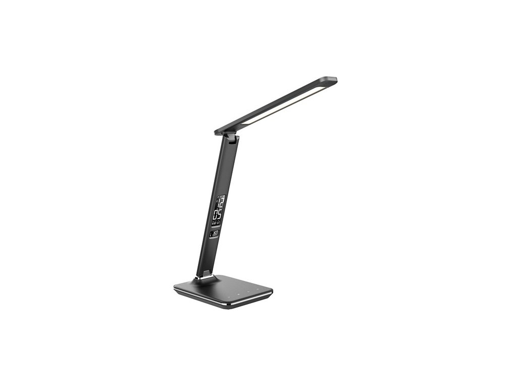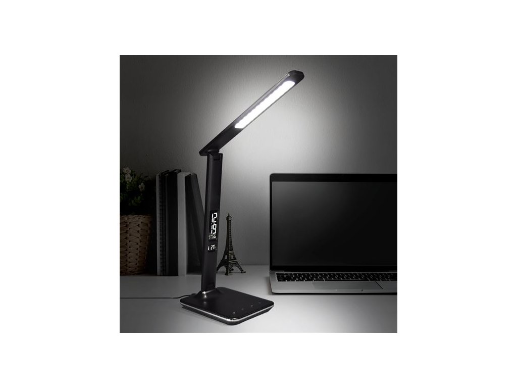 Stolová lampička značky Solight s integrovaným LED zdrojom o príkone 1 x 9 W vynikne v moderne zariadených kanceláriách a pracovniach. Je vyrobená z odolného a pevného plastu, ktorý svojou štruktúrou pripomína vzhľad čiernej kože. Jej výhodou je možnosť 5-stupňového plynulého stmievania a možnosť voľby módu 3 farieb svetla – teplá, neutrálna biela a studená biela (3000 K - 6000 K). Jej základňa hranatého tvaru je protišmyková s dotykovými tlačidlami pre zapnutie/vypnutie, reguláciu jasu a zmenu módu svietenia. Svietidlo je napájané cez napájací adaptér AC 100-240V (súčasťou balenia). Jeho rameno aj difúzor sú výškovo nastaviteľné. Na ramene je umiestnený veľký displej s funkciou času, kalendára, budíka a teplomera (nutné použiť batériu CR2032). Svit je vyžarovaný v uhle 120 stupňov. Celkové rozmery lampy sú 41 x 11,6 x 18,1 cm. Vzťahuje sa na ňu záruka 2 roky.