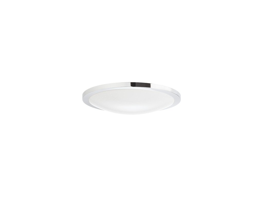 Vnútorné stropné svietidlo chránené proti vlhkosti, vybavené SMD LED diódami, konštrukciou z bieleho kovu, opálovým PMMA difúzorom s trblietavým efektom a vonkajším rámom z chrómovaného kovu.