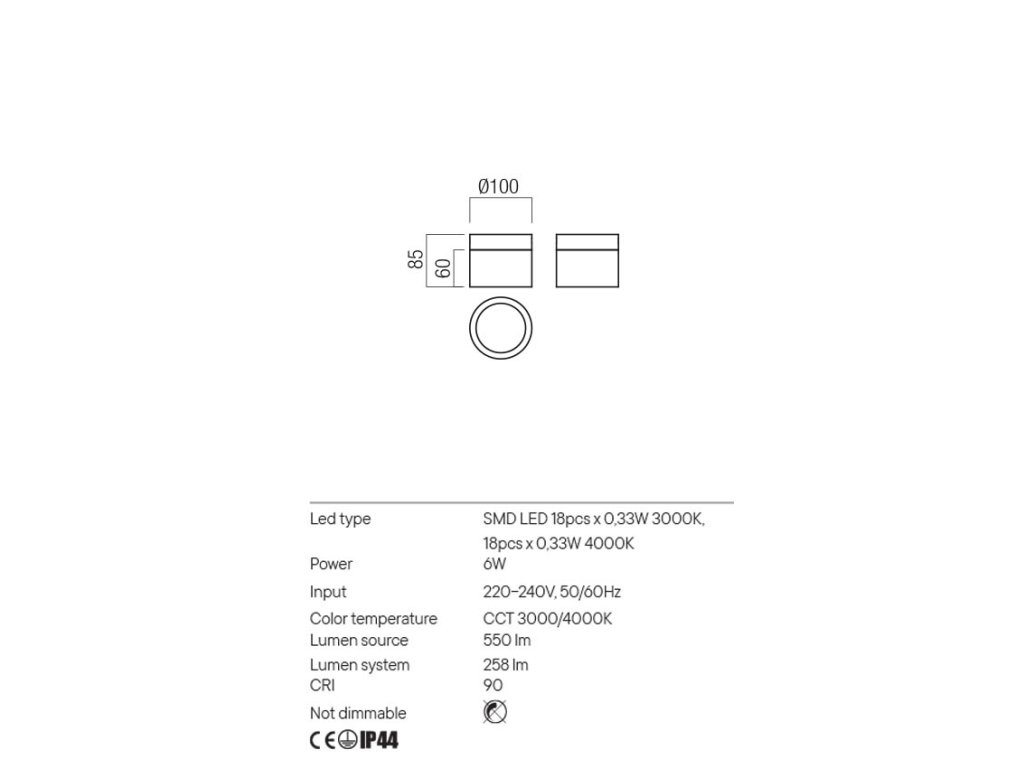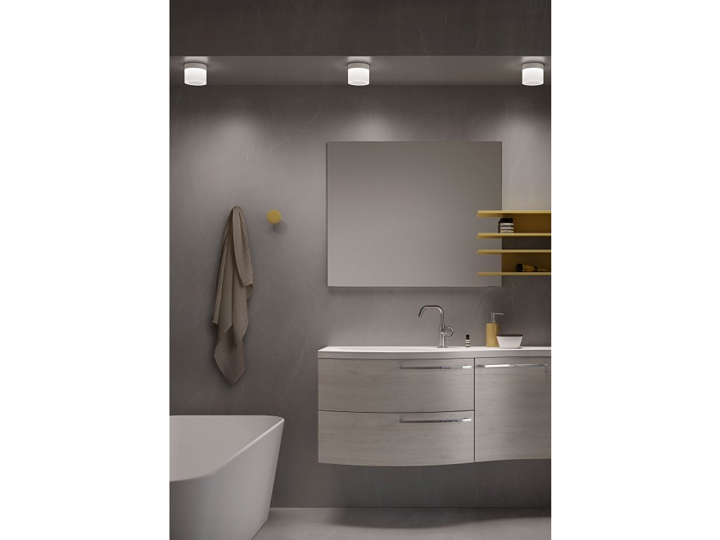Interiérové stropné svietidlo s ochranou proti vlhkosti, osadené SMD LED diódami, s možnosťou voľby teploty farby svetla, elektrostaticky lakovaná kovová konštrukcia k dispozícii v troch farebných variantoch so saténovým akrylovým difúzorom.