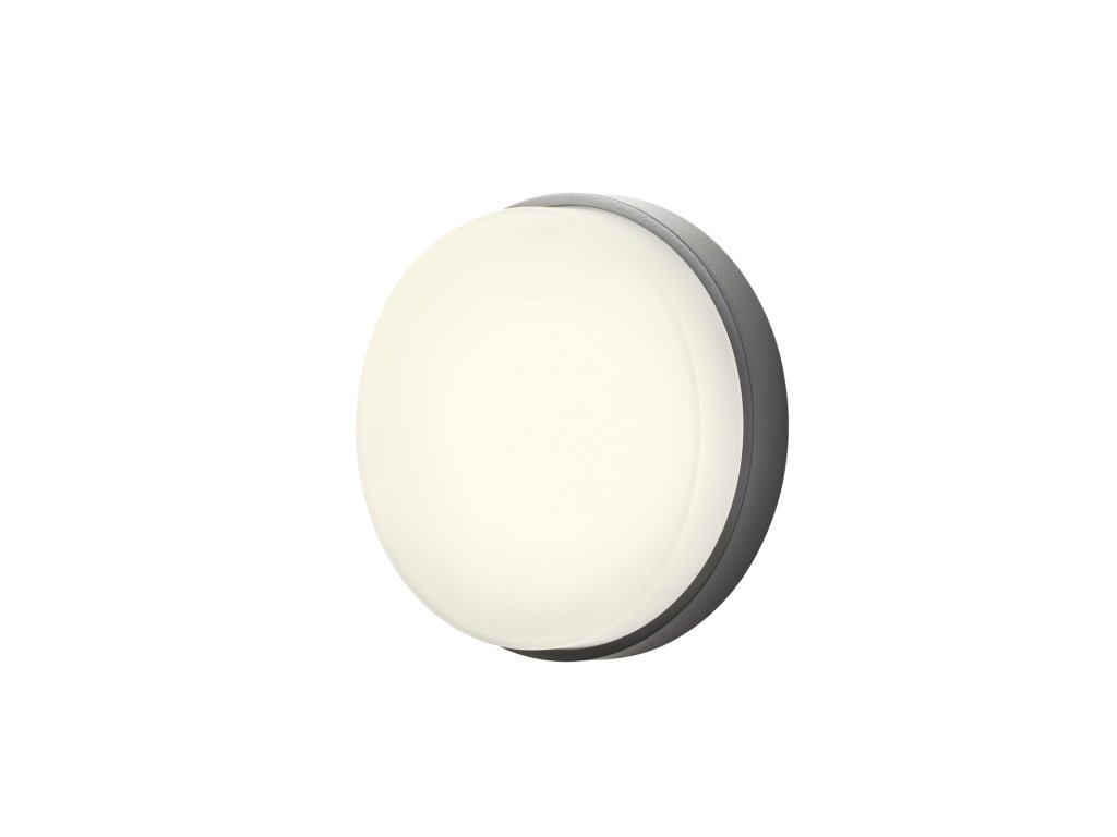 Vonkajšie nástenné/stropné svietidlo vybavené SMD LED diódami, telo z tlakovo liateho hliníka elektrostaticky lakované v tmavosivej farbe, difúzor z opálového polykarbonátu.