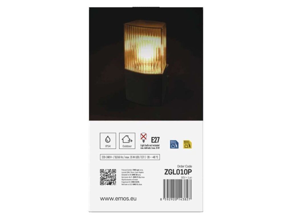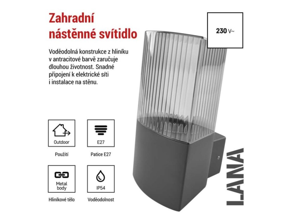 farba: antracit|farba svetla: –|dosah PIR senzora: –|energetická trieda použitého svetelného zdroja: –|fotovoltický článok: ne|frekvencia: 50/60 Hz|index podania farieb (CRI): –|kategória: CLASSIC|krytie: IP54|materiál: hliník|materiál plast:materiál AC|napätie: 220-240 V~|pätica (uchytenie žiarovky): E27|PIR senzor: ne|príkon: –|predajný obal: 1 ks, krabička|rada: LANA|rozmer: 119 × 106 × 218 mm|rozsah pracovnej teploty: -20 ~ +40 °C|so: chromatickosti: –|vstavaný vypínač: ne|žiarovka súčasťou balenia: ne|zdroj svetla: –|životnosť: –Dodatočné parametre