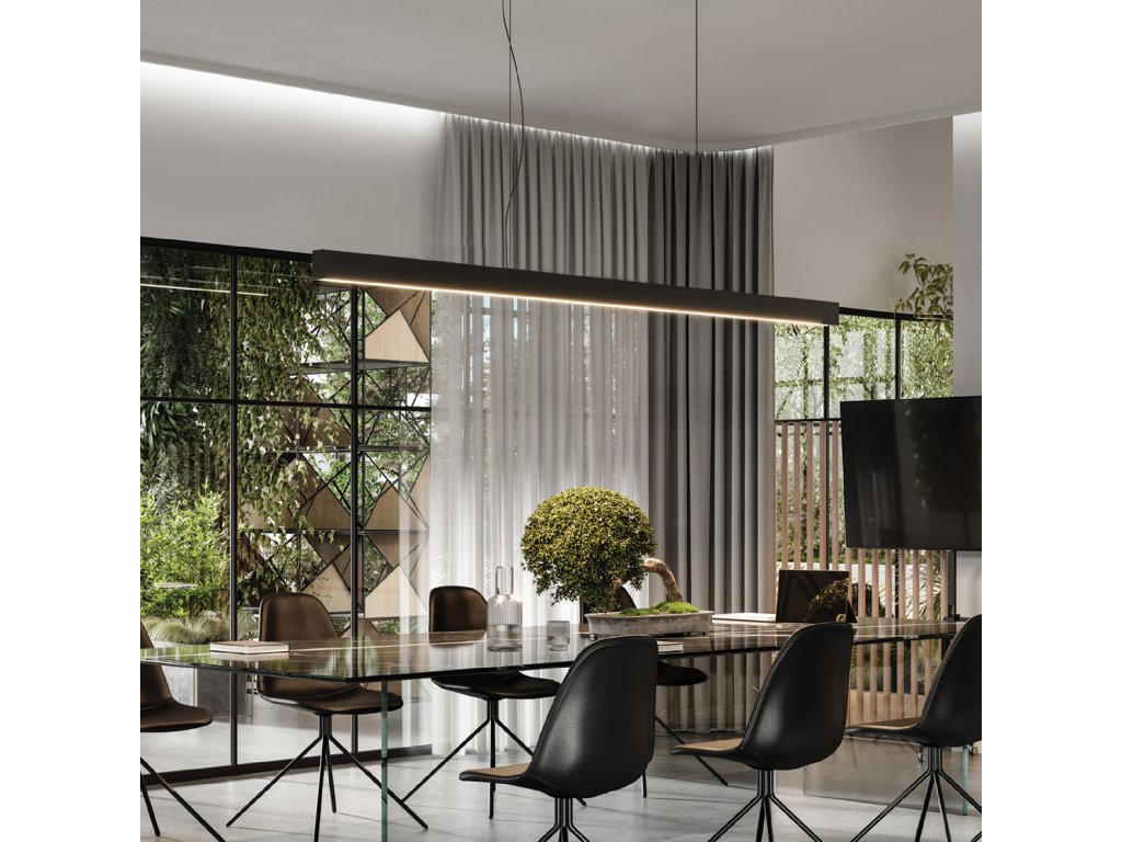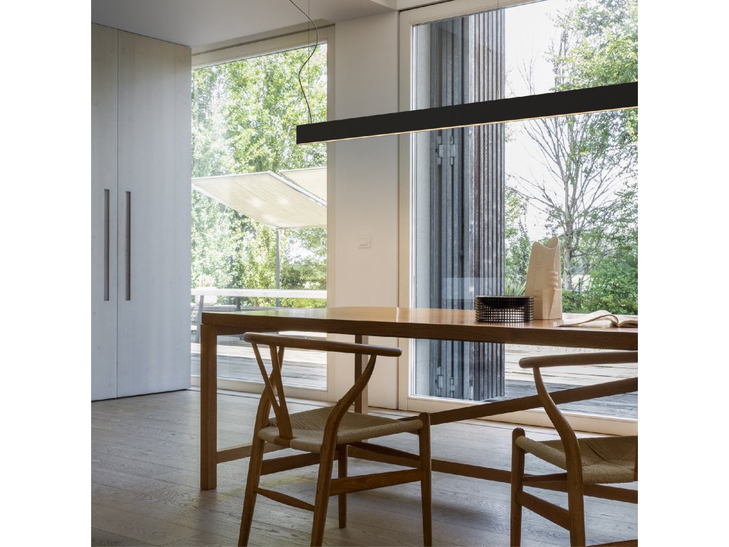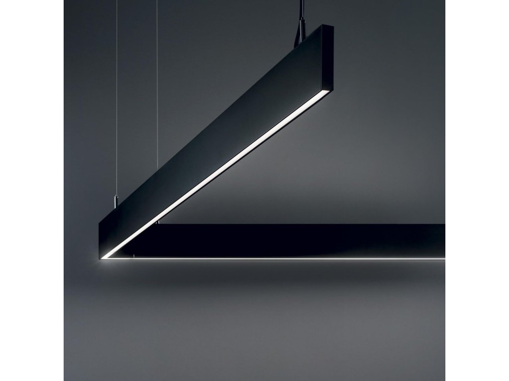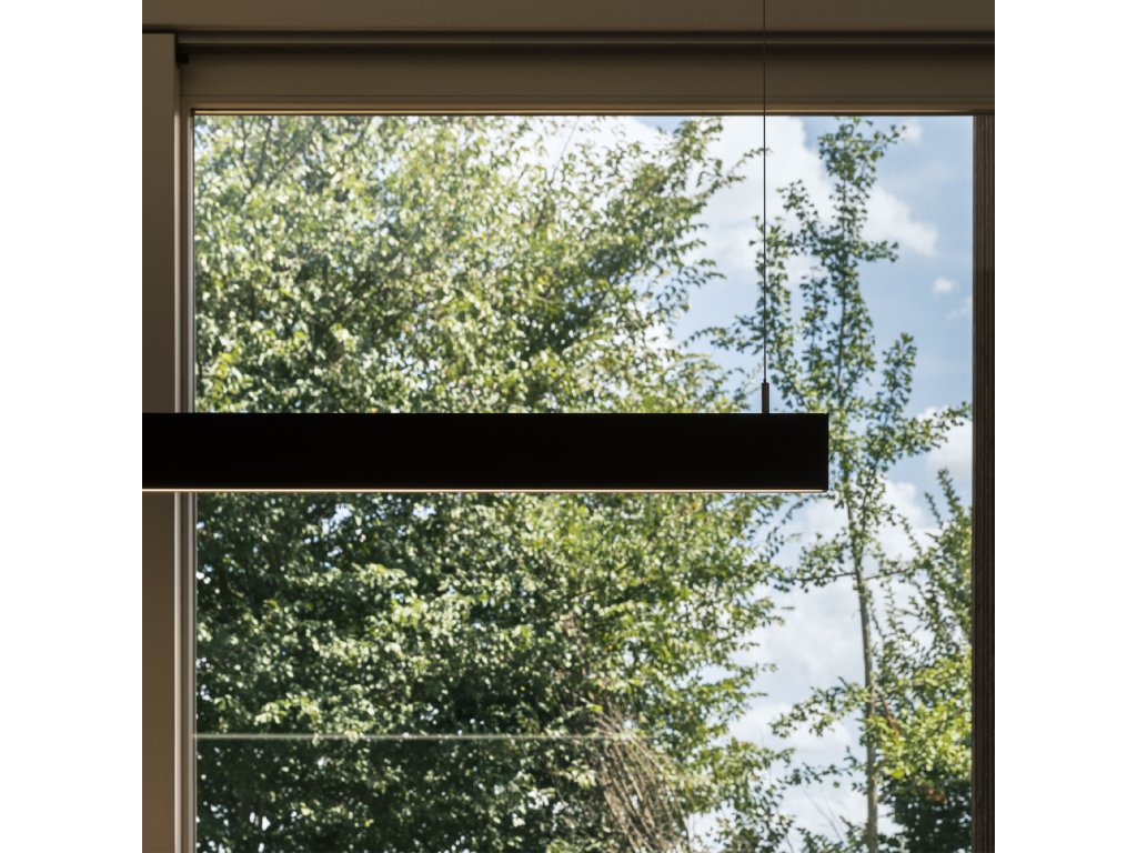 - šírka svietidla je iba 2 cm a dĺžka zavesenia je nastaviteľná pri inštalácii až do 159,5 cm. Je vyrobené z odľahčeného tlakovo odlievaného hliníka s vonkajším čiernym lakovaním.