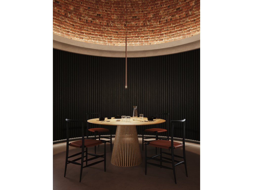 V spodnej časti svietidla je ukrytý transparentný difúzor z metakrylátu, ktorý ukrýva 3W LED zdroj s vysokým CRI 90, zaisťujúcim verné podanie farieb. Teplé svetlo vytvára útulnú atmosféru – či už ako solitér nad stolíkom pre dvoch, alebo ako súčasť väčšie svetelné kompozície.