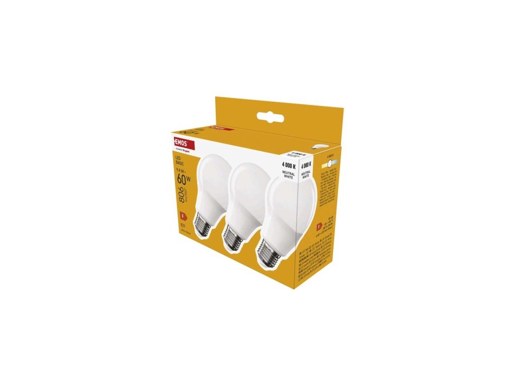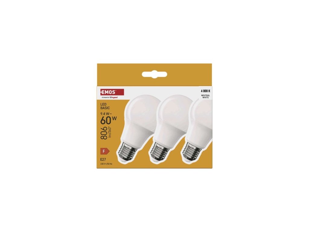 farba svetla: neutrálna biela|energetická trieda: F|index podania farieb (CRI): 80|kompatibilita: –|náhrada za žiarovku: 60 W|napätie: 230 V~/50 Hz|notifikácia do mobilnej aplikácie: ne|ovládanie hlasovými asistentmi: ne|pätica (uchytenie žiarovky): cyklov: 20 000|podporované OS: –|prenosová frekvencia: –|príkon: 9,4 W|predajný obal: 3 ks, krabička|protokol: –|rad: BASIC|rozmer: 60 × 60 × 110 (max.) mm|stmievateľná: ne|sel 806 lm|technológia: LED|teplota chromatickosti: 4 000 K|tvar: A60|typ čipov: SMD|účinník: 0,50|uhol vyžarovania: 200°|záručná doba: 2 roky|životnosť: 20 000 hodínDodatočné parametre