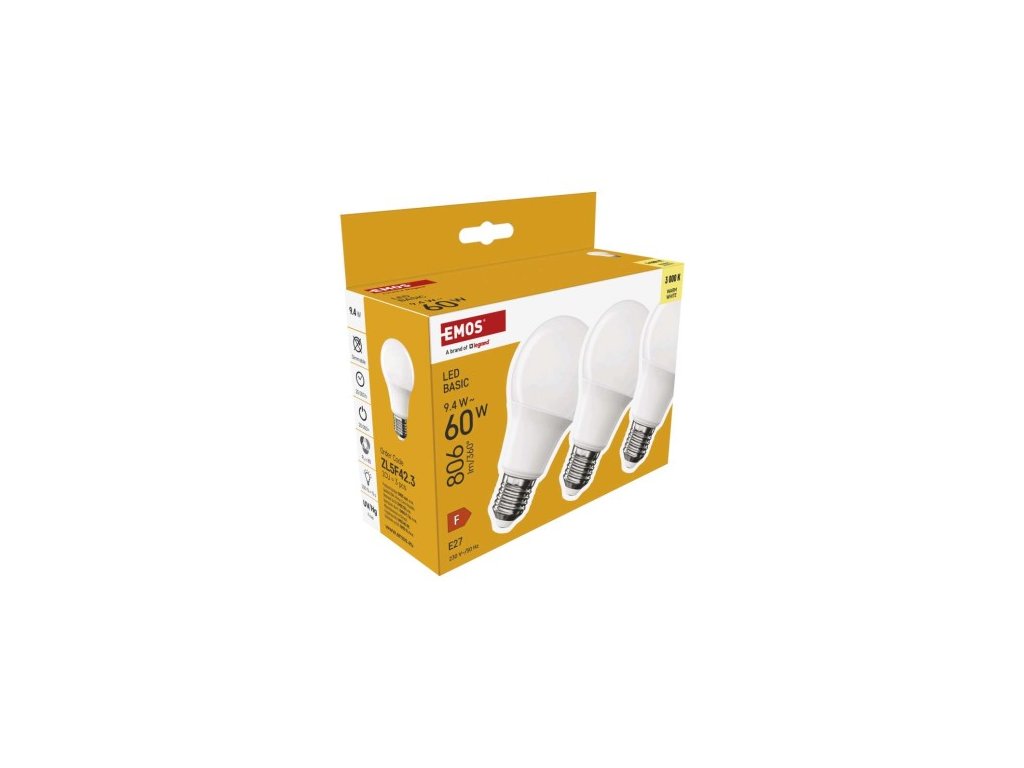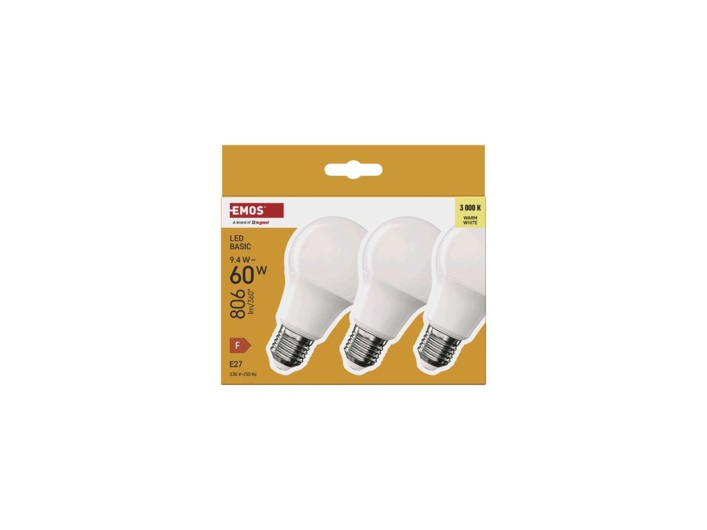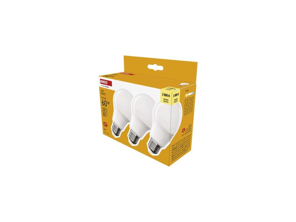 farba svetla: teplá biela|energetická trieda: F|index podania farieb (CRI): 80|kompatibilita: –|náhrada za žiarovku: 60 W|napätie: 230 V~/50 Hz|notifikácia do mobilnej aplikácie: ne|ovládanie hlasovými asistentmi: ne|pätica (uchytenie žiarovky): E2 cyklov: 20 000|podporované OS: –|prenosová frekvencia: –|príkon: 9,4 W|predajný obal: 3 ks, krabička|protokol: –|rad: BASIC|rozmer: 60 × 60 × 110 (max.) mm|stmievateľná: ne|sel 806 lm|technológia: LED|teplota chromatickosti: 3 000 K|tvar: A60|typ čipov: SMD|účinník: 0,50|uhol vyžarovania: 200°|záručná doba: 2 roky|životnosť: 20 000 hodínDodatočné parametre