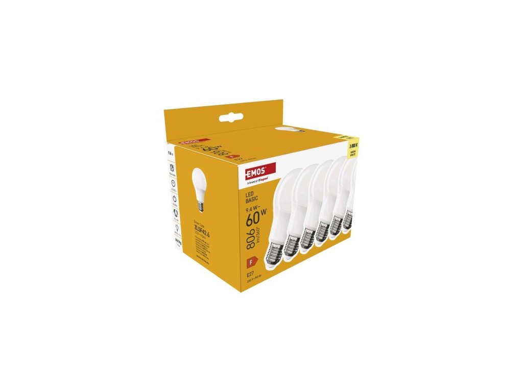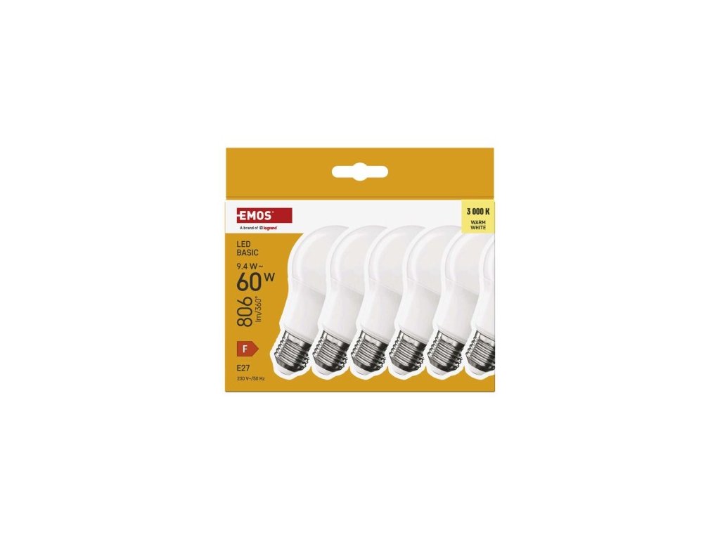 farba svetla: teplá biela|energetická trieda: F|index podania farieb (CRI): 80|kompatibilita: –|náhrada za žiarovku: 60 W|napätie: 230 V~/50 Hz|notifikácia do mobilnej aplikácie: ne|ovládanie hlasovými asistentmi: ne|pätica (uchytenie žiarovky): E2 cyklov: 20 000|podporované OS: –|prenosová frekvencia: –|príkon: 9,4 W|predajný obal: 6 ks, krabička|protokol: –|rad: BASIC|rozmer: 60 × 60 × 110 (max.) mm|stmievateľná: ne|s| 806 lm|technológia: LED|teplota chromatickosti: 3 000 K|tvar: A60|typ čipov: SMD|účinník: 0,50|uhol vyžarovania: 200°|záručná doba: 2 roky|životnosť: 20 000 hodínDodatočné parametre