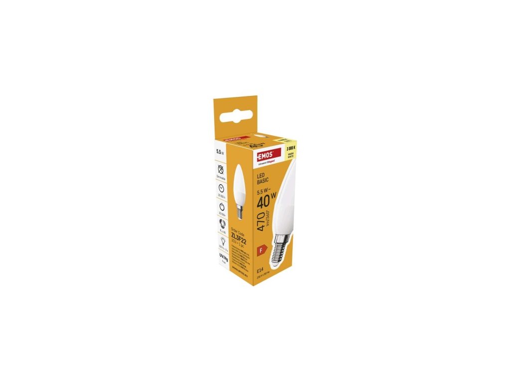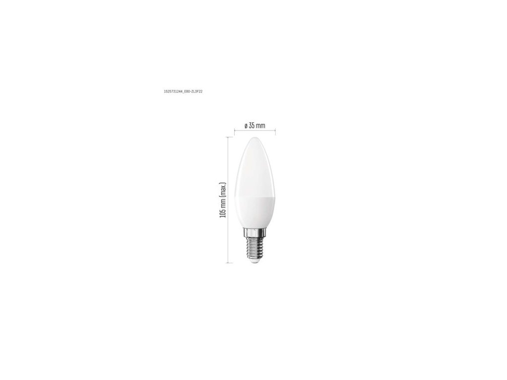 farba svetla: teplá biela|energetická trieda: F|index podania farieb (CRI): 80|kompatibilita: –|náhrada za žiarovku: 40 W|napätie: 230 V~/50 Hz|notifikácia do mobilnej aplikácie: ne|ovládanie hlasovými asistentmi: ne|pätica (uchytenie žiarovky):| cyklov: 20 000|podporované OS: –|prenosová frekvencia: –|príkon: 5,5 W|predajný obal: 1 ks, krabička|protokol: –|rad: BASIC|rozmer: 35 × 35 × 105 (max.) mm|stmievateľná: ne| tok: 470 lm|technológia: LED|teplota chromatickosti: 3 000 K|tvar: sviečka|typ čipov: SMD|účinník: 0,50|uhol vyžarovania: 180°|záručná doba: 2 roky|životnosť: 20 000 hodínDodatočné parametre