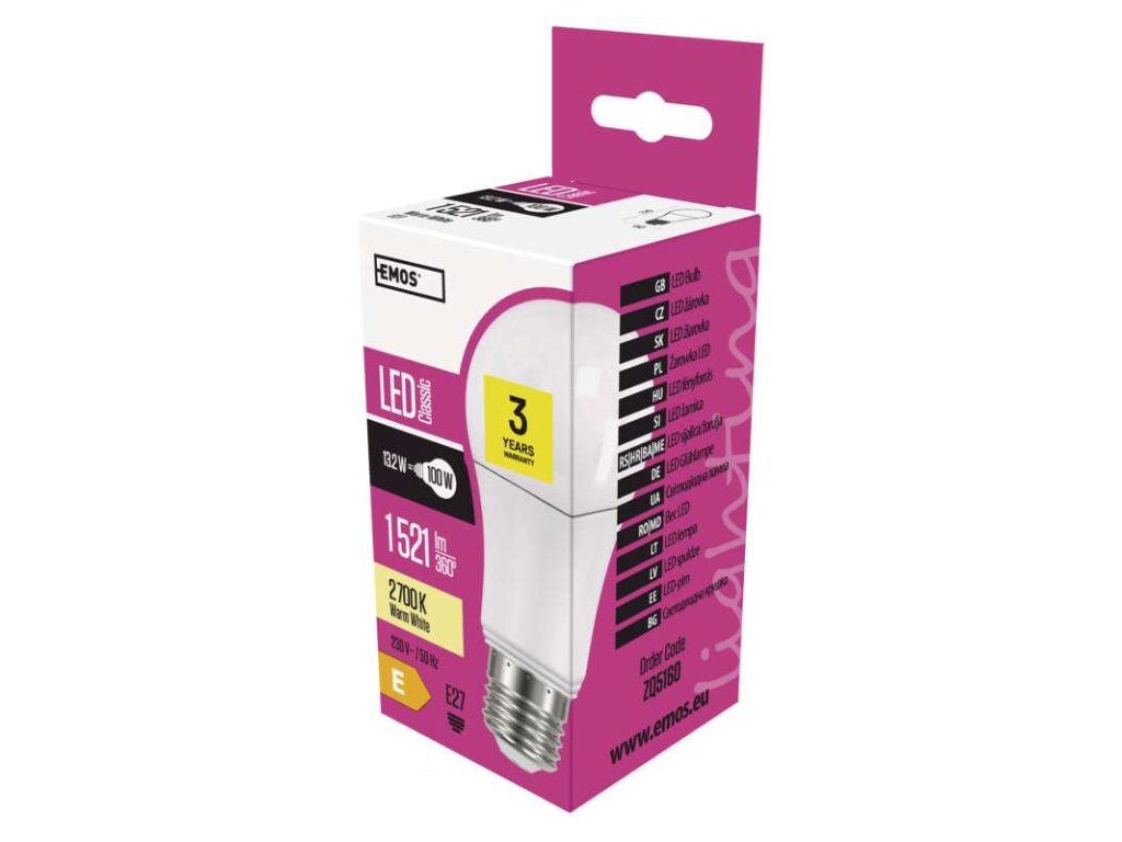 LED žiarovka s päticou E27 s príkonom 13,2W, s výkonom 1521lm lúmenov (náhrada za žiarovku 100W). Farba svetla teplá biela 2700K, 30.000 hod. svietivosti, uhol vyžarovania 180 °. Svetelný zdroj nie je stmievateľný.