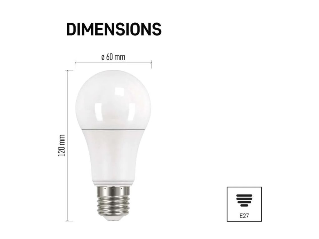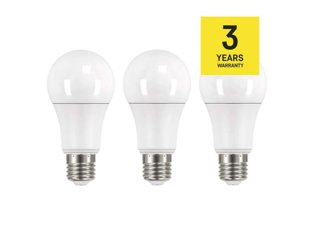 farba svetla: teplá biela|energetická trieda: E|index podania farieb (CRI): 82|kompatibilita: –|náhrada za žiarovku: 100 W|napätie: 230 V~/50 Hz|notifikácia do mobilnej aplikácie: –|ovládanie hlasovými asistentmi: –|pätica (uchytenie žiarovky):| cyklov: 25 000|podporované OS: –|prenosová frekvencia: –|príkon: 13,2 W|predajný obal: 3 ks, krabička|protokol: –|rad: CLASSIC|rozmer: 120 × 60 × 60 mm|stmievateľná: ne|s| tok: 1 521 lm|technológia: LED|teplota chromatičnosti: 2 700 K|tvar: A60|typ čipov: SMD|účnik: 0,56|uhol vyžarovania: 180°|záručná doba: 3 roky|životnosť: 30 000 hodínDodatočné parametre