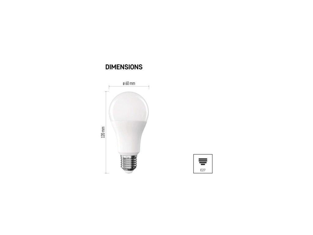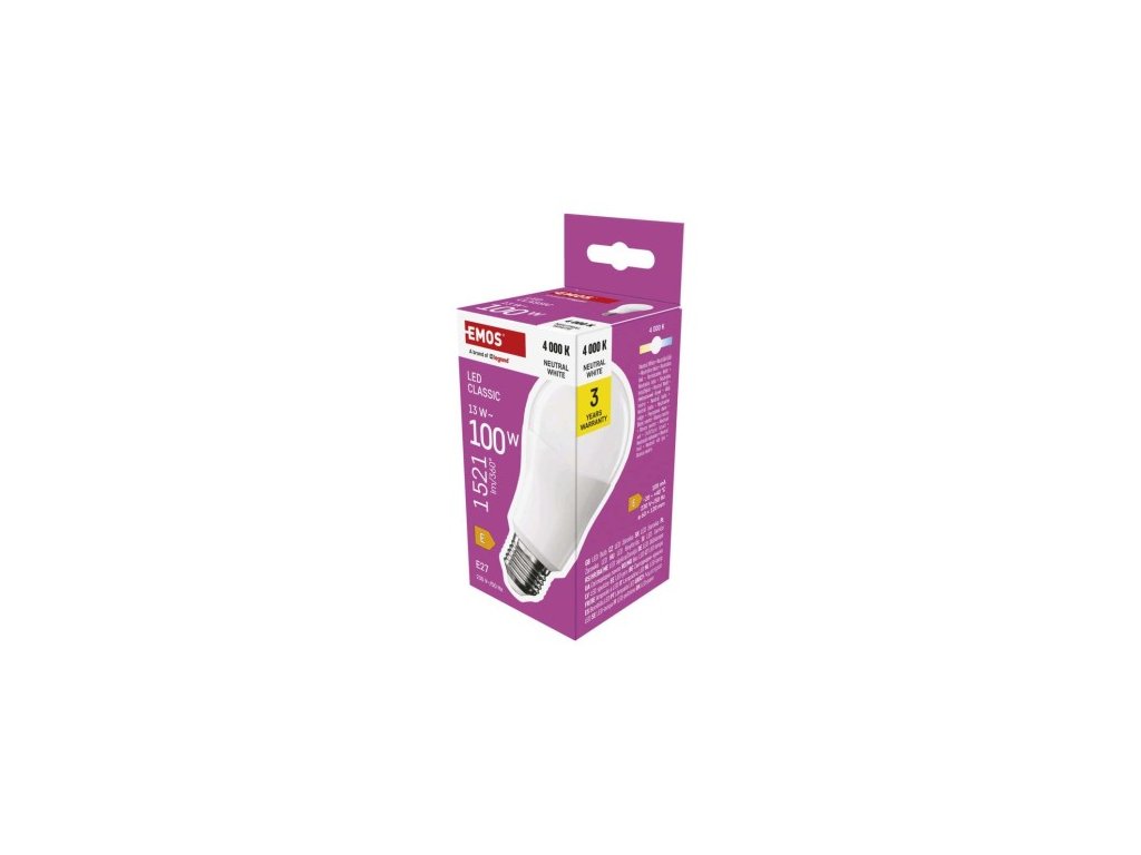 farba svetla: neutrálna biela|energetická trieda: E|index podania farieb (CRI): 80|kompatibilita: –|náhrada za žiarovku: 100 W|napätie: 230 V~/50 Hz|notifikácia do mobilnej aplikácie: ne|ovládanie hlasovými asistentmi: ne|pätica (uchytenie žiarovky): cyklov: 30 000|podporované OS: –|prenosová frekvencia: –|príkon: 13 W|predajný obal: 1 ks, krabička|protokol: –|rad: CLASSIC|rozmer: 60 × 60 × 120 mm/stmievateľná: ne|svetelná: 1 521 lm|technológia: LED|teplota chromatickosti: 4 000 K|tvar: A60|typ čipov: SMD|účnik: 0,50|uhol vyžarovania: 180°|záručná doba: 3 roky|životnosť: 30 000 hodínDodatočné parametre