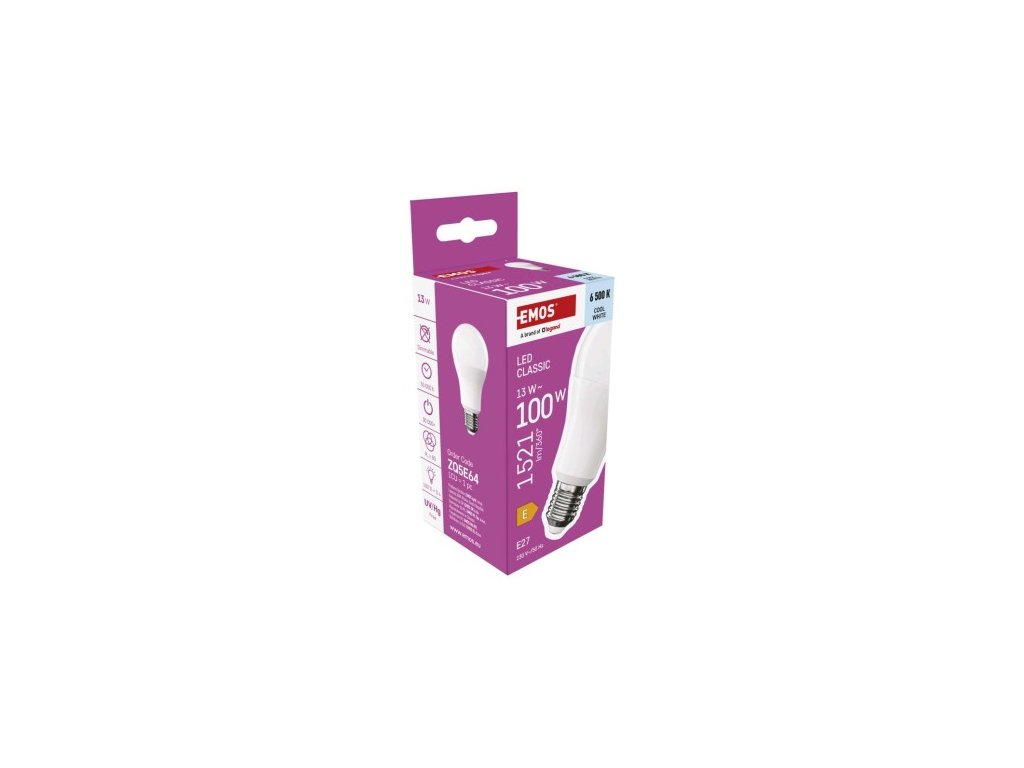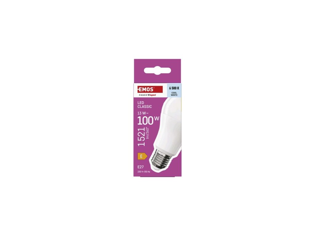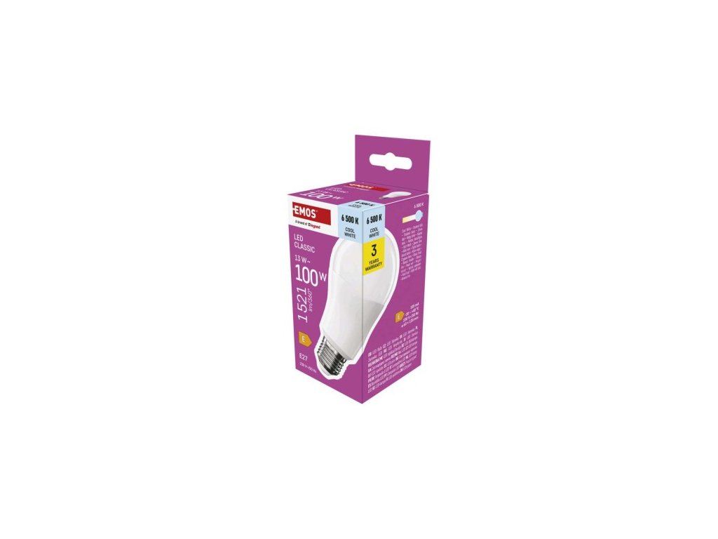 farba svetla: studená biela|energetická trieda: E|index podania farieb (CRI): 80|kompatibilita: –|náhrada za žiarovku: 100 W|napätie: 230 V~/50 Hz|notifikácia do mobilnej aplikácie: ne|ovládanie hlasovými asistentmi: ne|pätica (uchytenie žiarovky): cyklov: 30 000|podporované OS: –|prenosová frekvencia: –|príkon: 13 W|predajný obal: 1 ks, krabička|protokol: –|rad: CLASSIC|rozmer: 60 × 60 × 120 mm/stmievateľná: ne|svetelná: 1 521 lm|technológia: LED|teplota chromatickosti: 6 500 K|tvar: A60|typ čipov: SMD|účinník: 0,50|uhol vyžarovania: 180°|záručná doba: 3 roky|životnosť: 30 000 hodínDodatočné parametre