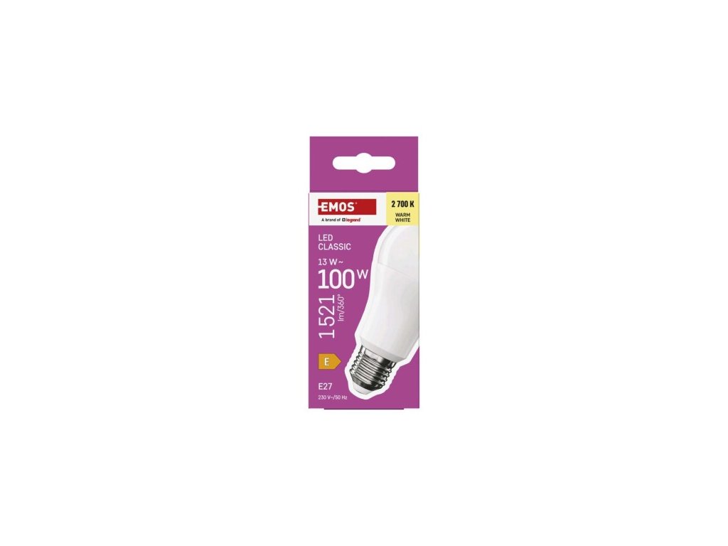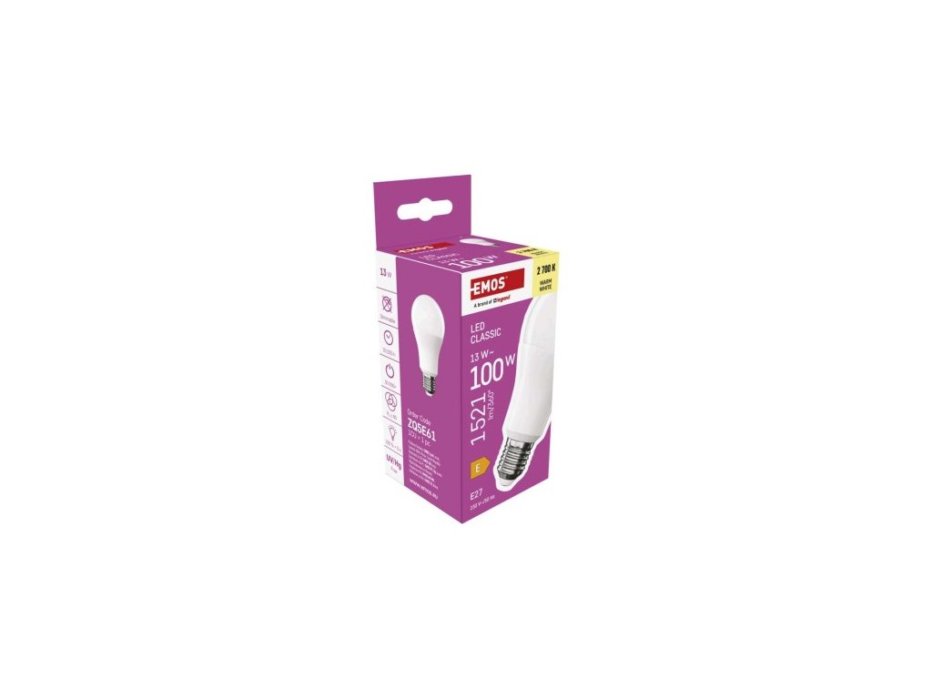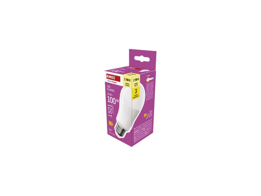 farba svetla: teplá biela|energetická trieda: E|index podania farieb (CRI): 80|kompatibilita: –|náhrada za žiarovku: 100 W|napätie: 230 V~/50 Hz|notifikácia do mobilnej aplikácie: ne|ovládanie hlasovými asistentmi: ne|pätica (uchytenie žiarovky): cyklov: 30 000|podporované OS: –|prenosová frekvencia: –|príkon: 13 W|predajný obal: 1 ks, krabička|protokol: –|rad: CLASSIC|rozmer: 60 × 60 × 120 mm/stmievateľná: ne|svetelná: 1 521 lm|technológia: LED|teplota chromatickosti: 2 700 K|tvar: A60|typ čipov: SMD|účinník: 0,50|uhol vyžarovania: 180°|záručná doba: 3 roky|životnosť: 30 000 hodínDodatočné parametre