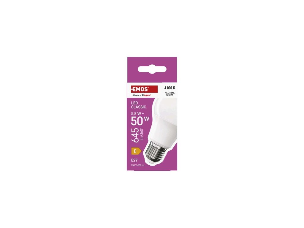 farba svetla: neutrálna biela|energetická trieda: E|index podania farieb (CRI): 80|kompatibilita: –|náhrada za žiarovku: 50 W|napätie: 230 V~/50 Hz|notifikácia do mobilnej aplikácie: ne|ovládanie hlasovými asistentmi: ne|pätica (uchytenie žiarovky): E| cyklov: 30 000|podporované OS: –|prenosová frekvencia: –|príkon: 5,8 W|predajný obal: 1 ks, krabička|protokol: –|rad: CLASSIC|rozmer: 60 × 60 × 107 mm|stmievateľná: ne|seľ| 645 lm|technológia: LED|teplota chromatičnosti: 4 000 K|tvar: A60|typ čipov: SMD|účnik: 0,50|uhol vyžarovania: 180°|záručná doba: 3 roky|životnosť: 30 000 hodínDodatočné parametre