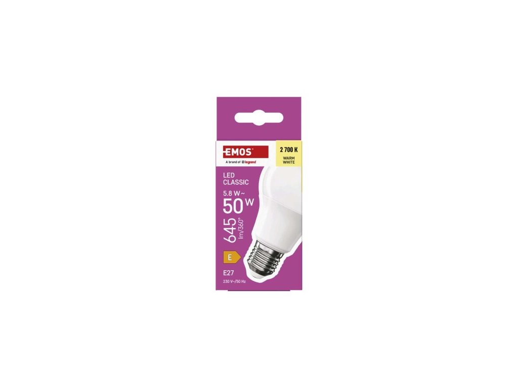 farba svetla: teplá biela|energetická trieda: E|index podania farieb (CRI): 80|kompatibilita: –|náhrada za žiarovku: 50 W|napätie: 230 V~/50 Hz|notifikácia do mobilnej aplikácie: ne|ovládanie hlasovými asistentmi: ne|pätica (uchytenie žiarovky): E2 cyklov: 30 000|podporované OS: –|prenosová frekvencia: –|príkon: 5,8 W|predajný obal: 1 ks, krabička|protokol: –|rad: CLASSIC|rozmer: 60 × 60 × 107 mm|stmievateľná: ne|seľ| 645 lm|technológia: LED|teplota chromatickosti: 2 700 K|tvar: A60|typ čipov: SMD|účinník: 0,50|uhol vyžarovania: 180°|záručná doba: 3 roky|životnosť: 30 000 hodínDodatočné parametre
