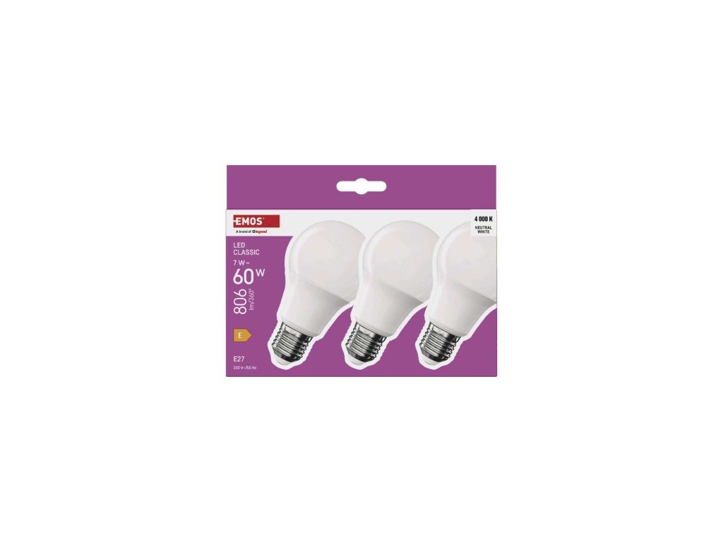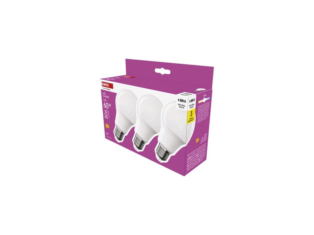 farba svetla: neutrálna biela|energetická trieda: E|index podania farieb (CRI): 80|kompatibilita: –|náhrada za žiarovku: 60 W|napätie: 230 V~/50 Hz|notifikácia do mobilnej aplikácie: ne|ovládanie hlasovými asistentmi: ne|pätica (uchytenie žiarovky): cyklov: 30 000|podporované OS: –|prenosová frekvencia: –|príkon: 7 W|predajný obal: 3 ks, krabička|protokol: –|rad: CLASSIC|rozmer: 60 × 60 × 107 mm|stmievateľná: ne|svetelná 806 lm|technológia: LED|teplota chromatičnosti: 4 000 K|tvar: A60|typ čipov: SMD|účnik: 0,50|uhol vyžarovania: 180°|záručná doba: 3 roky|životnosť: 30 000 hodínDodatočné parametre