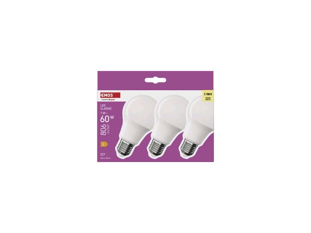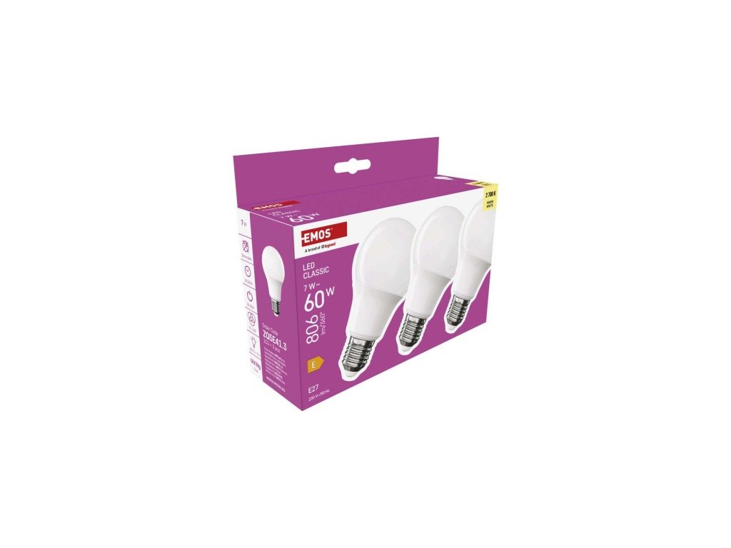 farba svetla: teplá biela|energetická trieda: E|index podania farieb (CRI): 80|kompatibilita: –|náhrada za žiarovku: 60 W|napätie: 230 V~/50 Hz|notifikácia do mobilnej aplikácie: ne|ovládanie hlasovými asistentmi: ne|pätica (uchytenie žiarovky): E2 cyklov: 30 000|podporované OS: –|prenosová frekvencia: –|príkon: 7 W|predajný obal: 3 ks, krabička|protokol: –|rad: CLASSIC|rozmer: 60 × 60 × 107 mm|stmievateľná: ne|svetelná 806 lm|technológia: LED|teplota chromatickosti: 2 700 K|tvar: A60|typ čipov: SMD|účinník: 0,50|uhol vyžarovania: 180°|záručná doba: 3 roky|životnosť: 30 000 hodínDodatočné parametre