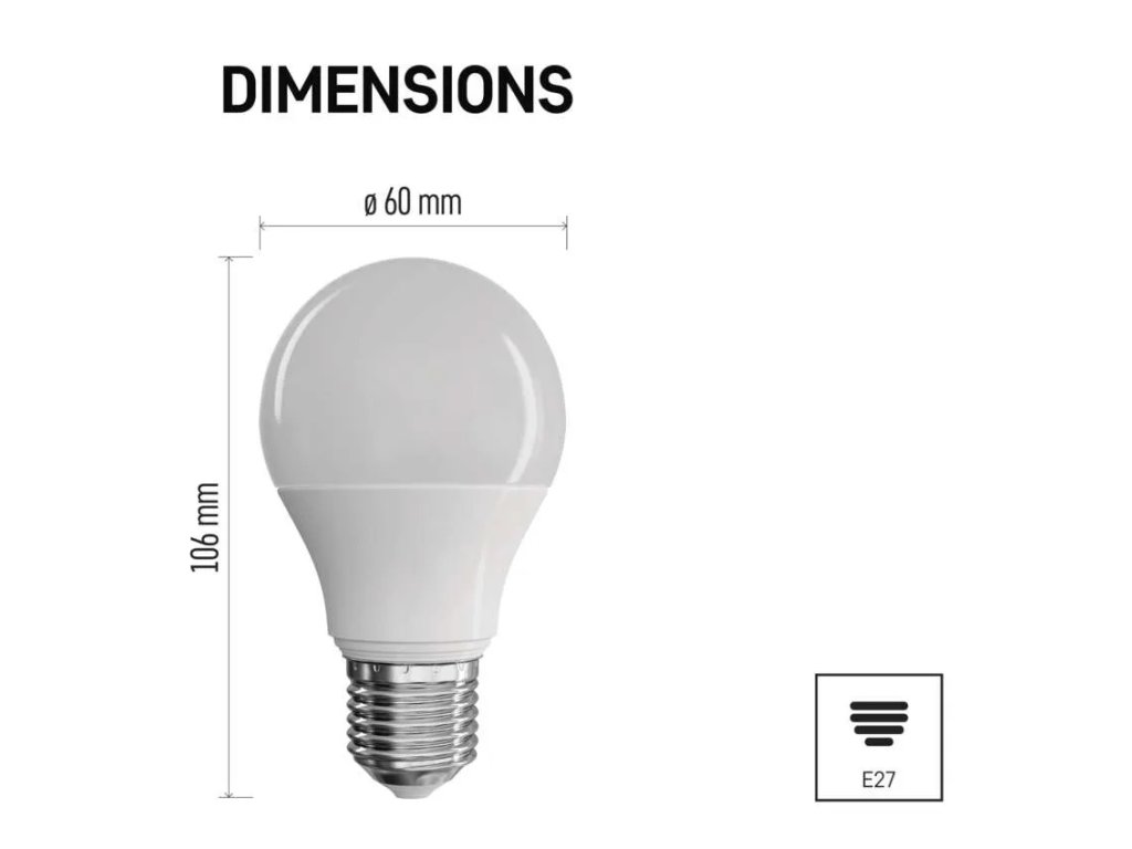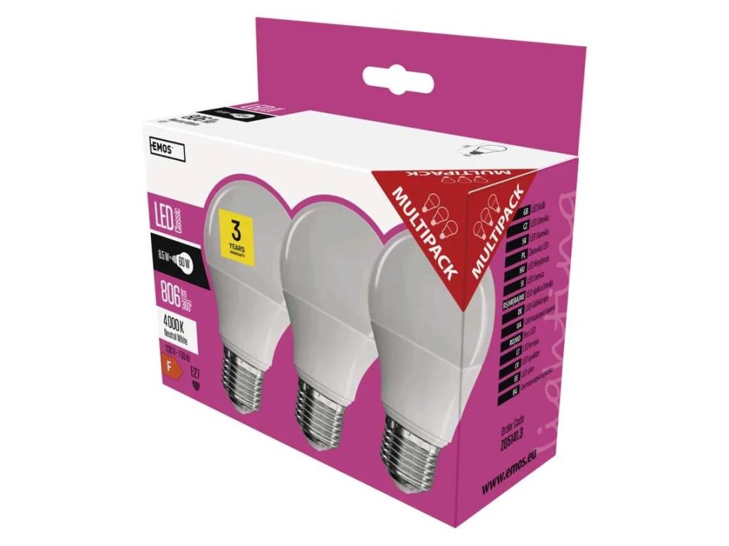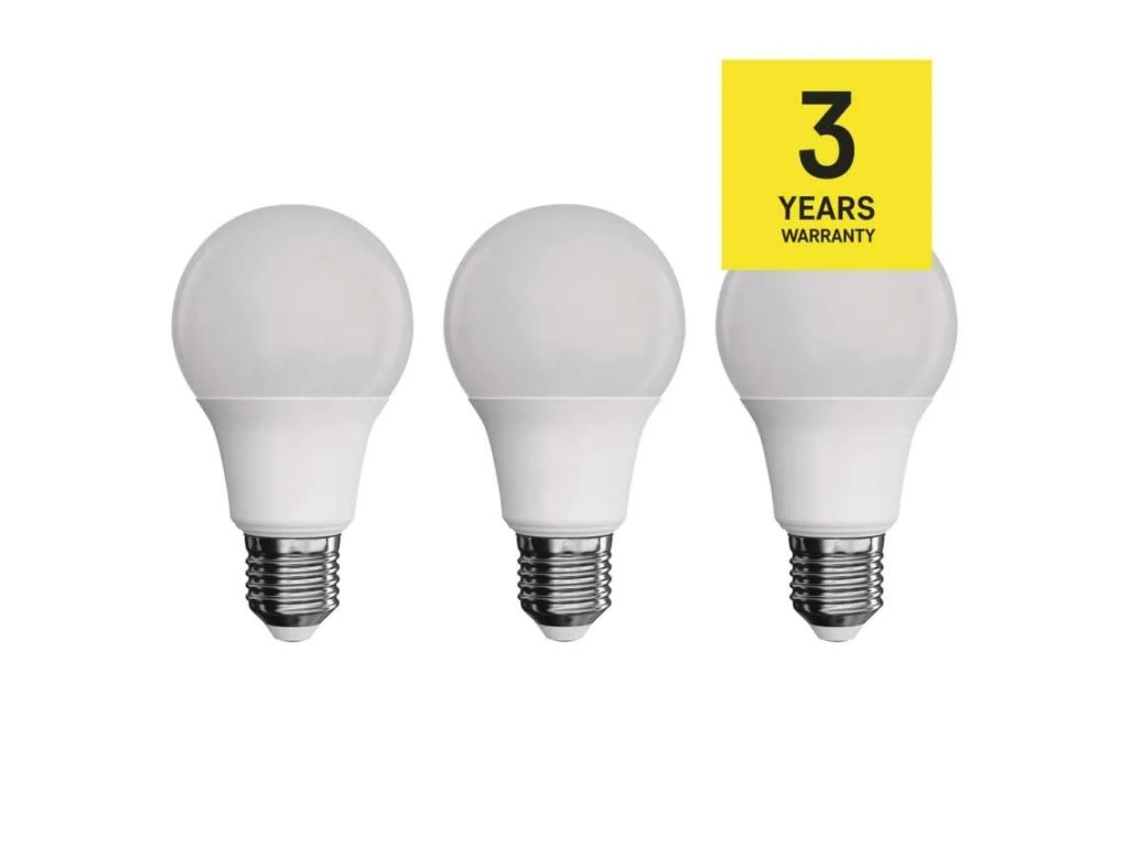 farba svetla: neutrálna biela|energetická trieda: F|index podania farieb (CRI): 80|kompatibilita: –|náhrada za žiarovku: 60 W|napätie: 230 V~/50 Hz|notifikácia do mobilnej aplikácie: –|ovládanie hlasovými asistentmi: –|pätica (uchytenie žiarovky): E| 25 000|podporované OS: –|prenosová frekvencia: –|príkon: 8,5 W|predajný obal: 3 ks, krabička|protokol: –|rad: CLASSIC|rozmer: 106 × 60 × 60 mm|stmievateľná: ne|svetelná účinnosť: ne|svetelná účinnosť: lm|technológia: LED|teplota chromatickosti: 4 000 K|tvar: A60|typ čipov: 2835|účnik: 0,5|uhol vyžarovania: 180°|záručná doba: 3 roky|životnosť: 30 000 hodínDodatočné parametre