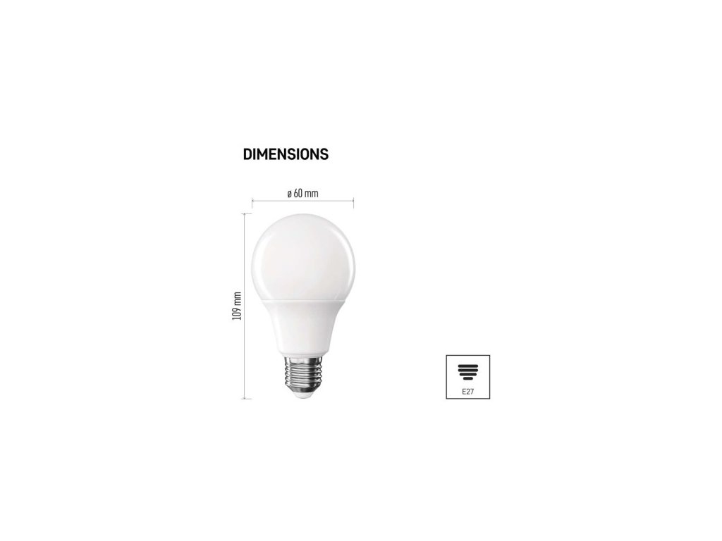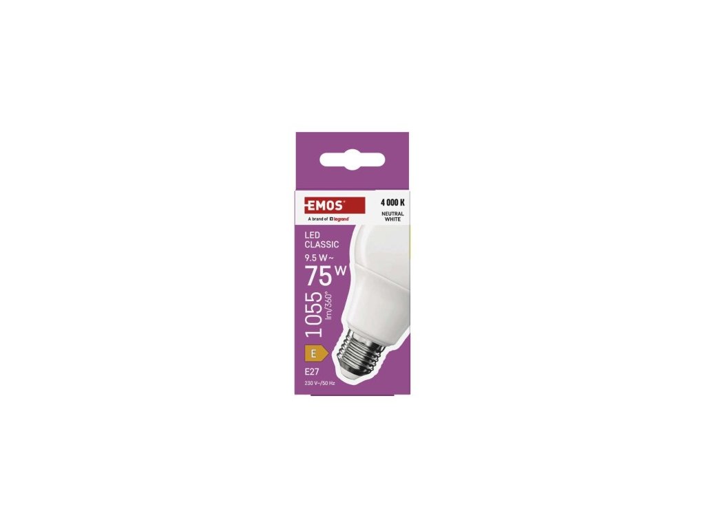 farba svetla: neutrálna biela|energetická trieda: E|index podania farieb (CRI): 80|kompatibilita: –|náhrada za žiarovku: 75 W|napätie: 230 V~/50 Hz|notifikácia do mobilnej aplikácie: ne|ovládanie hlasovými asistentmi: ne|pätica (uchytenie žiarovky): E| cyklov: 30 000|podporované OS: –|prenosová frekvencia: –|príkon: 9,5 W|predajný obal: 1 ks, krabička|protokol: –|rad: CLASSIC|rozmer: 60 × 60 × 109 mm|stmievateľná: ne|seľ| 1 055 lm|technológia: LED|teplota chromatickosti: 4 000 K|tvar: A60|typ čipov: SMD|účnik: 0,50|uhol vyžarovania: 180°|záručná doba: 3 roky|životnosť: 30 000 hodínDodatočné parametre