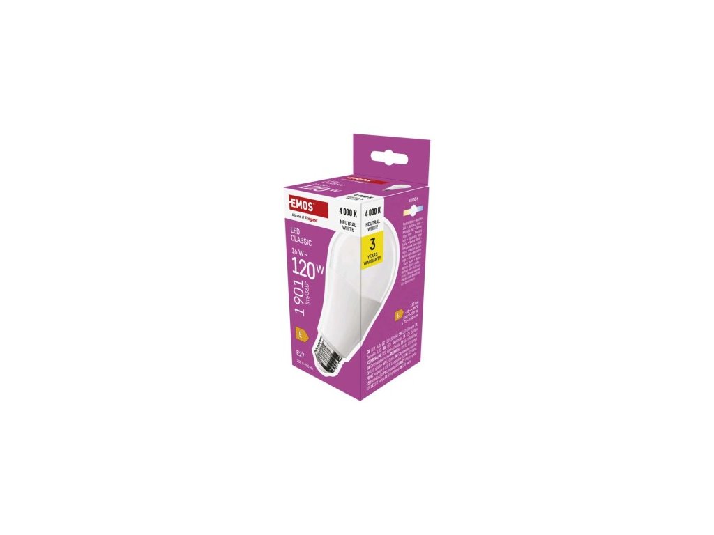 farba svetla: neutrálna biela|energetická trieda: E|index podania farieb (CRI): 80|kompatibilita: –|náhrada za žiarovku: 120 W|napätie: 230 V~/50 Hz|notifikácia do mobilnej aplikácie: ne|ovládanie hlasovými asistentmi: ne|pätica (uchytenie žiarovky): cyklov: 30 000|podporované OS: –|prenosová frekvencia: –|príkon: 16 W|predajný obal: 1 ks, krabička|protokol: –|rad: CLASSIC|rozmer: 71 × 71 × 142 mm|stmievateľná: ne|svetelná: ne|svetelná 1 901 lm|technológia: LED|teplota chromatickosti: 4 000 K|tvar: A70|typ čipov: SMD|účnik: 0,50|uhol vyžarovania: 180°|záručná doba: 3 roky|životnosť: 30 000 hodínDodatočné parametre