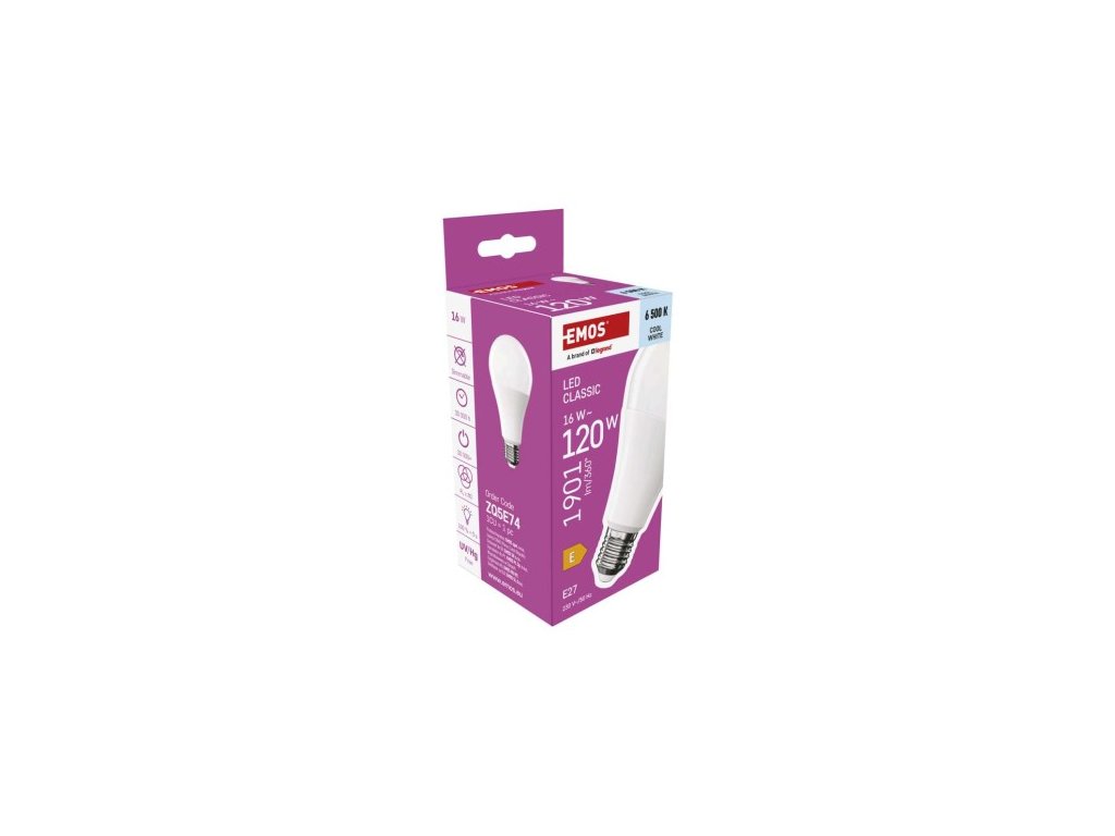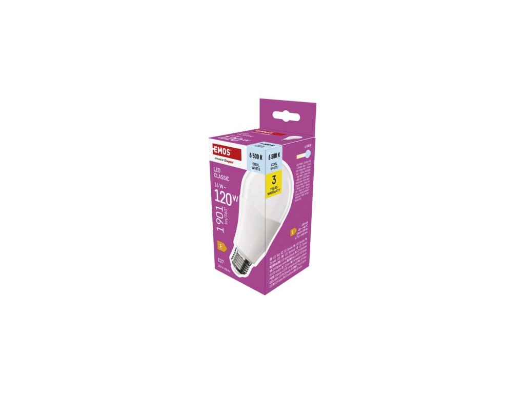 farba svetla: studená biela|energetická trieda: E|index podania farieb (CRI): 80|kompatibilita: –|náhrada za žiarovku: 120 W|napätie: 230 V~/50 Hz|notifikácia do mobilnej aplikácie: ne|ovládanie hlasovými asistentmi: ne|pätica (uchytenie žiarovky): E| cyklov: 30 000|podporované OS: –|prenosová frekvencia: –|príkon: 16 W|predajný obal: 1 ks, krabička|protokol: –|rad: CLASSIC|rozmer: 71 × 71 × 142 mm|stmievateľná: ne|svetelná: ne|svetelná 1 901 lm|technológia: LED|teplota chromatickosti: 6 500 K|tvar: A70|typ čipov: SMD|účinník: 0,50|uhol vyžarovania: 180°|záručná doba: 3 roky|životnosť: 30 000 hodínDodatočné parametre