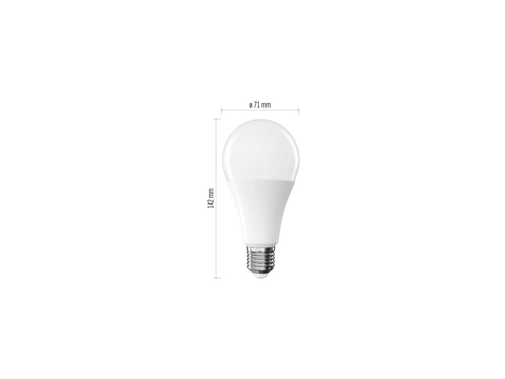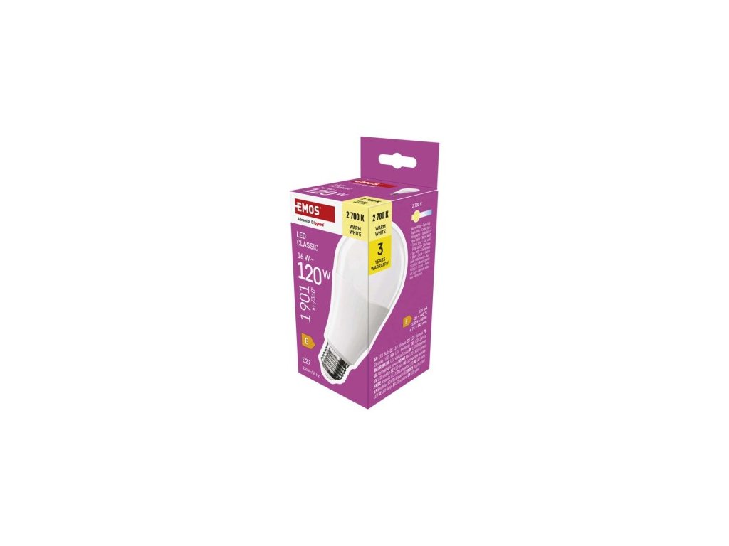 farba svetla: teplá biela|energetická trieda: E|index podania farieb (CRI): 80|kompatibilita: –|náhrada za žiarovku: 120 W|napätie: 230 V~/50 Hz|notifikácia do mobilnej aplikácie: ne|ovládanie hlasovými asistentmi: ne|pätica (uchytenie žiarovky): cyklov: 30 000|podporované OS: –|prenosová frekvencia: –|príkon: 16 W|predajný obal: 1 ks, krabička|protokol: –|rad: CLASSIC|rozmer: 71 × 71 × 142 mm|stmievateľná: ne|svetelná: ne|svetelná 1 901 lm|technológia: LED|teplota chromatickosti: 2 700 K|tvar: A70|typ čipov: SMD|účnik: 0,50|uhol vyžarovania: 180°|záručná doba: 3 roky|životnosť: 30 000 hodínDodatočné parametre
