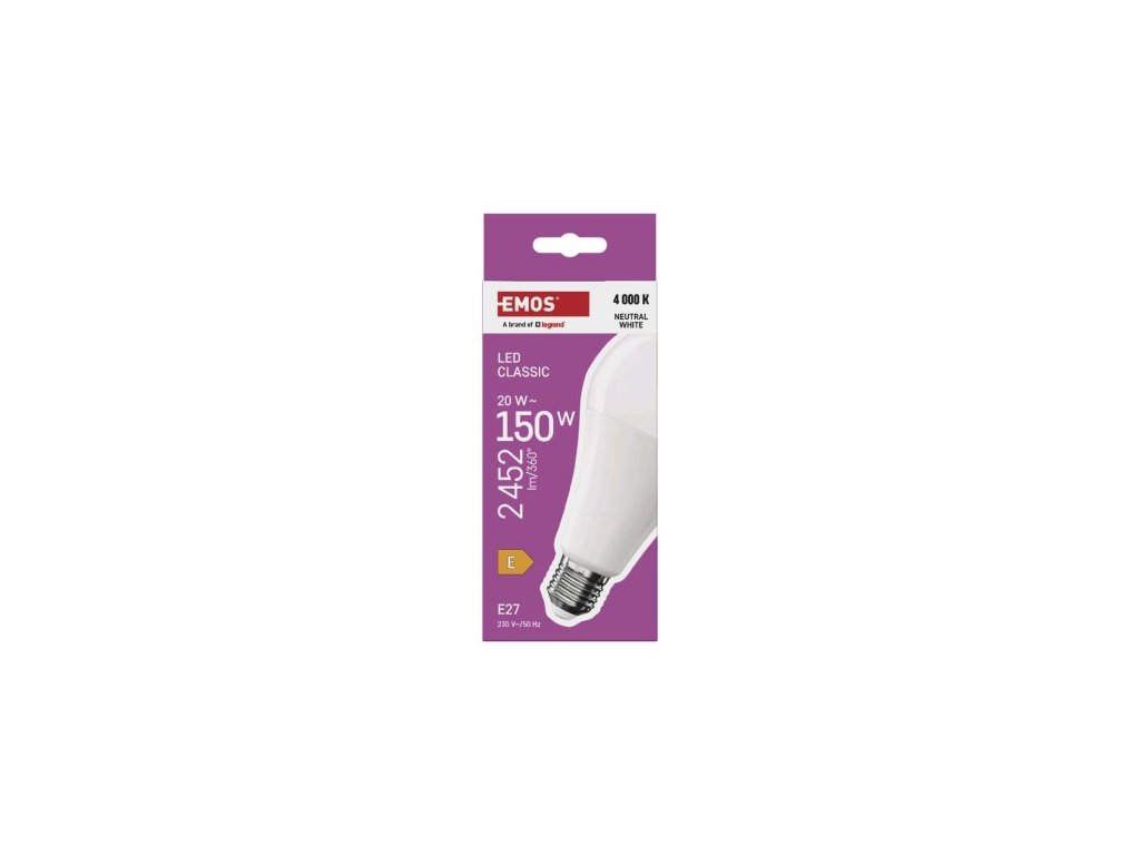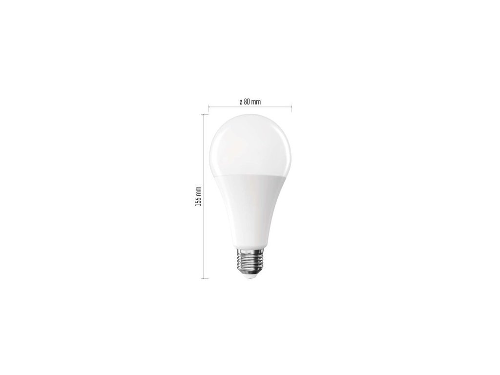 farba svetla: neutrálna biela|energetická trieda: E|index podania farieb (CRI): 80|kompatibilita: –|náhrada za žiarovku: 150 W|napätie: 230 V~/50 Hz|notifikácia do mobilnej aplikácie: ne|ovládanie hlasovými asistentmi: ne|pätica (uchytenie žiarovky): cyklov: 30 000|podporované OS: –|prenosová frekvencia: –|príkon: 20 W|predajný obal: 1 ks, krabička|protokol: –|rad: CLASSIC|rozmer: 80 × 80 × 156 mm|stmievateľná: ne|svetelná| 2 452 lm|technológia: LED|teplota chromatickosti: 4 000 K|tvar: A80|typ čipov: SMD|účnik: 0,50|uhol vyžarovania: 180°|záručná doba: 3 roky|životnosť: 30 000 hodínDodatočné parametre