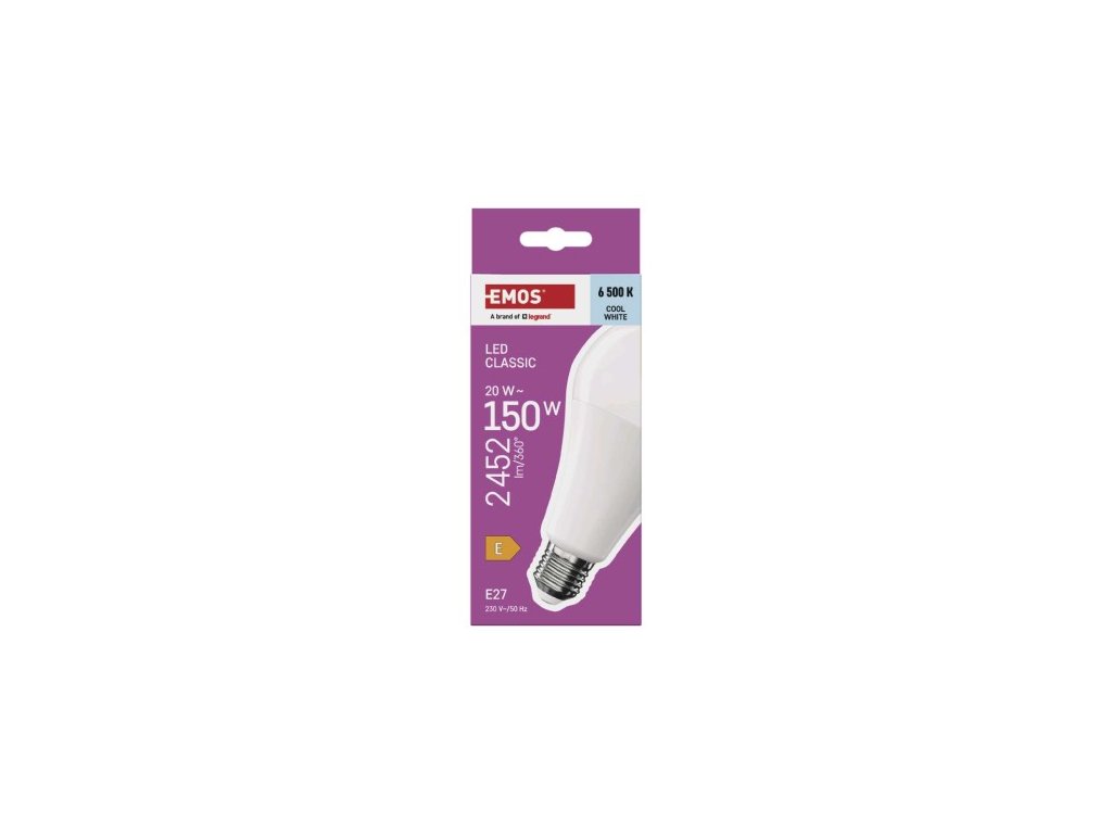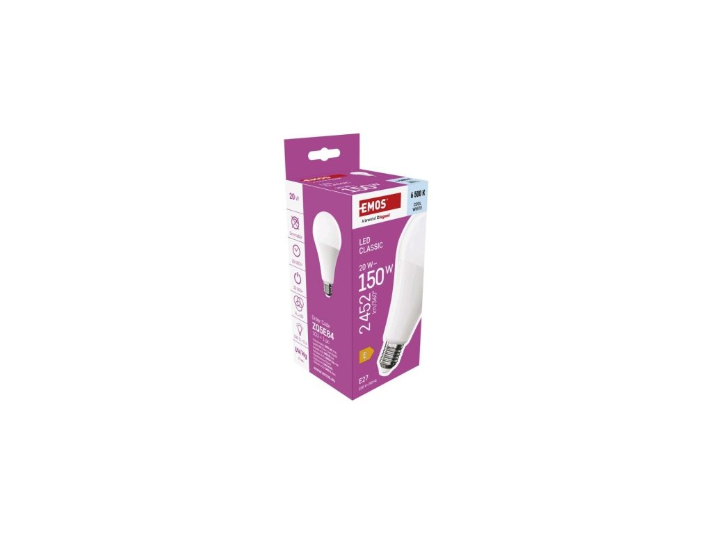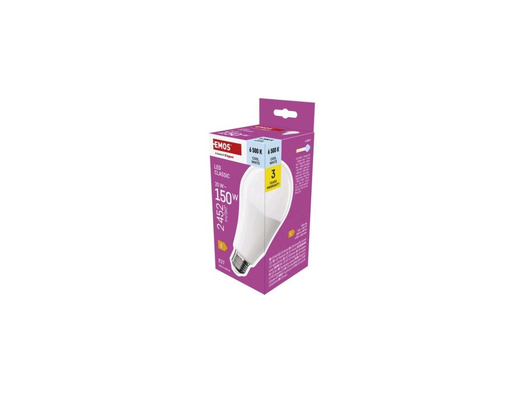 farba svetla: studená biela|energetická trieda: E|index podania farieb (CRI): 80|kompatibilita: –|náhrada za žiarovku: 150 W|napätie: 230 V~/50 Hz|notifikácia do mobilnej aplikácie: ne|ovládanie hlasovými asistentmi: ne|pätica (uchytenie žiarovky): cyklov: 30 000|podporované OS: –|prenosová frekvencia: –|príkon: 20 W|predajný obal: 1 ks, krabička|protokol: –|rad: CLASSIC|rozmer: 80 × 80 × 156 mm|stmievateľná: ne|svetelná| 2 452 lm|technológia: LED|teplota chromatičnosti: 6 500 K|tvar: A80|typ čipov: SMD|účnik: 0,50|uhol vyžarovania: 180°|záručná doba: 3 roky|životnosť: 30 000 hodínDodatočné parametre