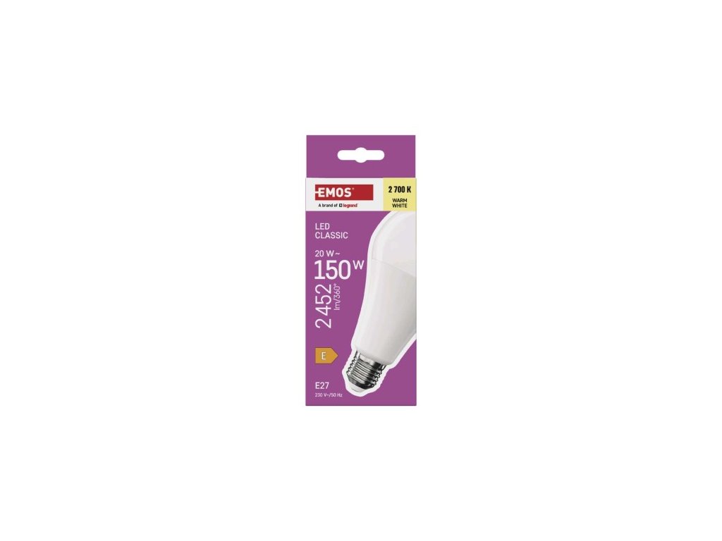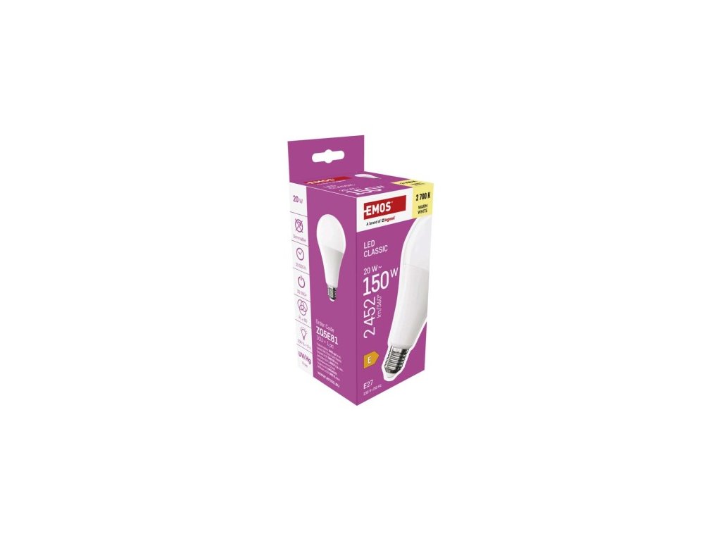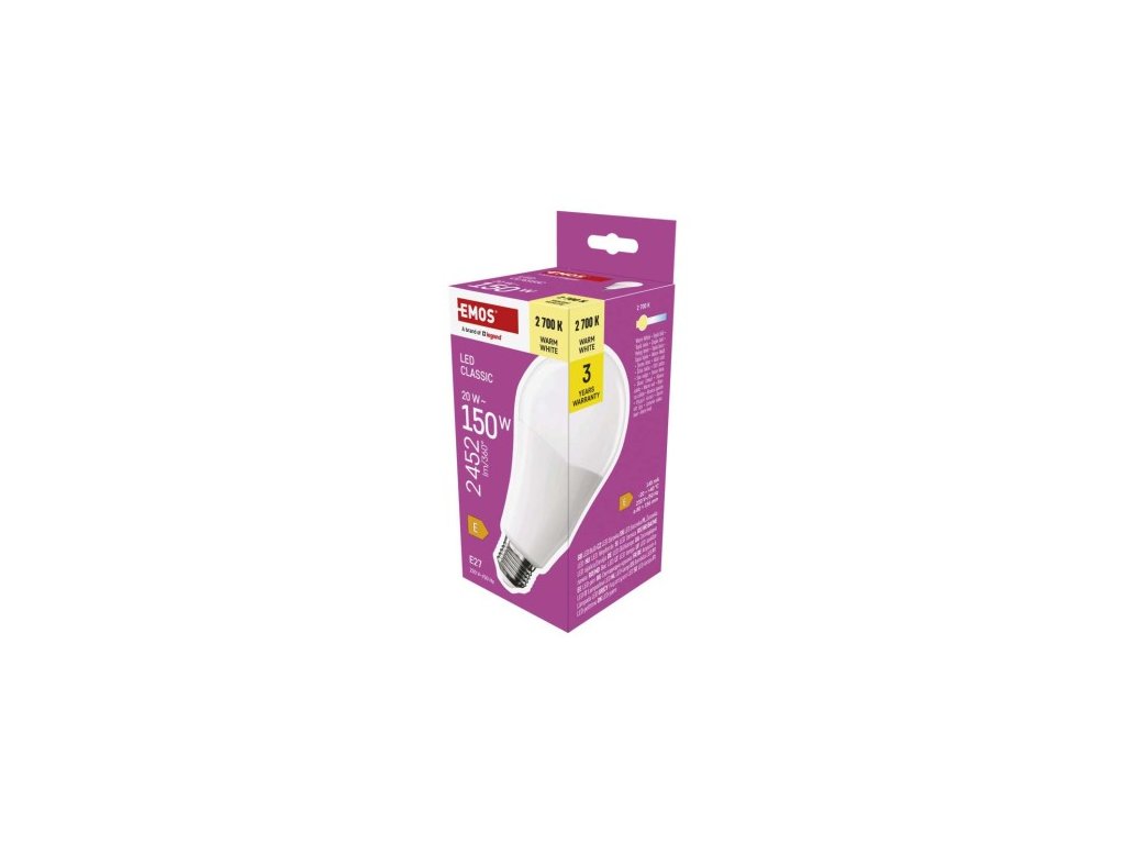 farba svetla: teplá biela|energetická trieda: E|index podania farieb (CRI): 80|kompatibilita: –|náhrada za žiarovku: 150 W|napätie: 230 V~/50 Hz|notifikácia do mobilnej aplikácie: ne|ovládanie hlasovými asistentmi: ne|pätica (uchytenie žiarovky): E| cyklov: 30 000|podporované OS: –|prenosová frekvencia: –|príkon: 20 W|predajný obal: 1 ks, krabička|protokol: –|rad: CLASSIC|rozmer: 80 × 80 × 156 mm|stmievateľná: ne|svetelná| 2 452 lm|technológia: LED|teplota chromatickosti: 2 700 K|tvar: A80|typ čipov: SMD|účnik: 0,50|uhol vyžarovania: 180°|záručná doba: 3 roky|životnosť: 30 000 hodínDodatočné parametre