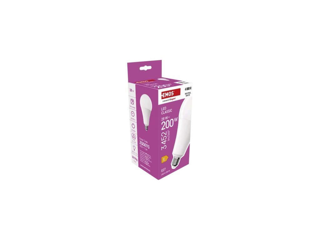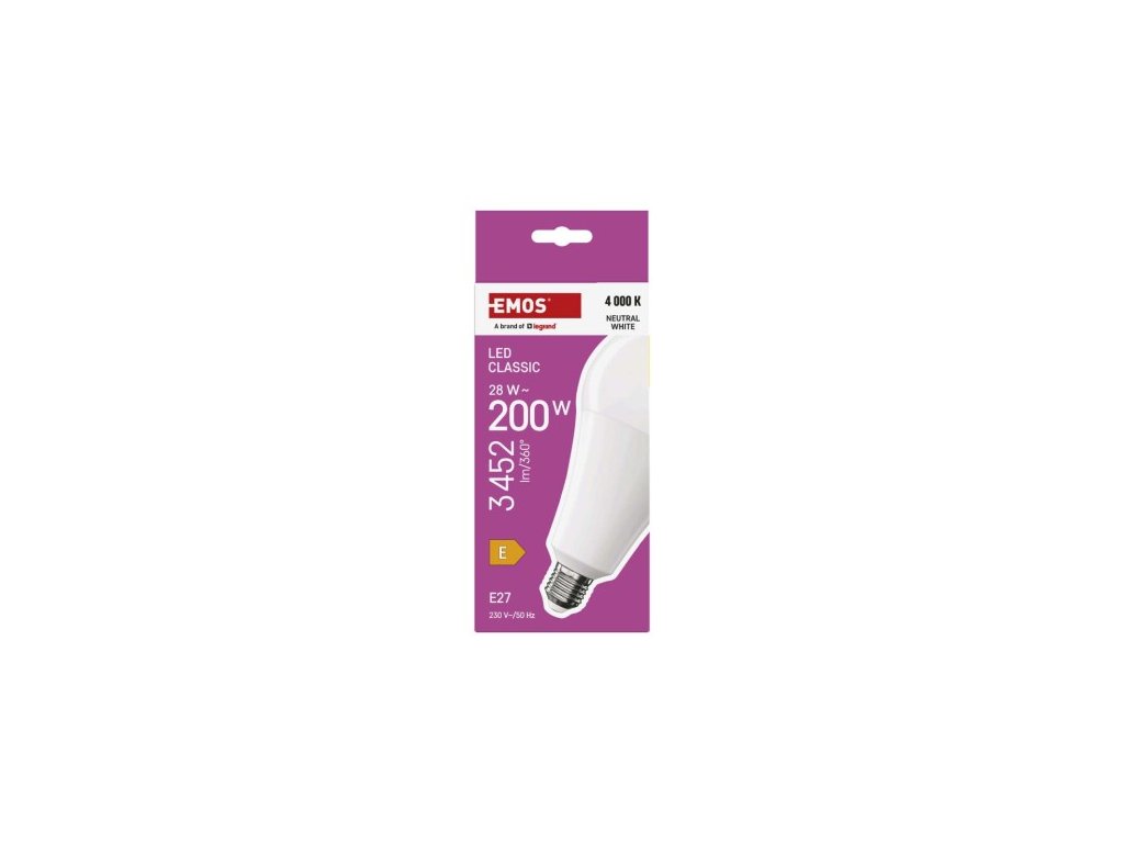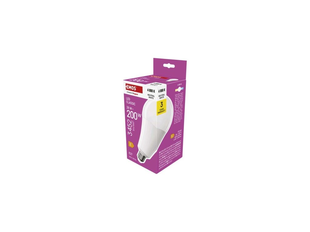 farba svetla: neutrálna biela|energetická trieda: E|index podania farieb (CRI): 80|kompatibilita: neuvádza sa|náhrada za žiarovku: 200 W|napätie: 230 V~/50 Hz|notifikácia do mobilnej aplikácie: neuvádza sa|ovládanie hlasovými asistentmi: neuvádza sa| neuvádza sa|počet spínacích cyklov: 30 000|podporované OS: neuvádza sa|prenosová frekvencia: neuvádza sa|príkon: 28 W|predajný obal: 1 ks, krabička|protokol: neuvádza sa|rad: CLASSIC|rozmer: 95 × 95 × 95 × účinnosť: 123 lm/W|svetelný tok: 3 452 lm|technológia: LED|teplota chromatičnosti: 4 000 K|tvar: A95|typ čipov: SMD|účinník: 0,90|uhol vyžarovania: 180°|3 záručná doba:0Dodatočné parametre