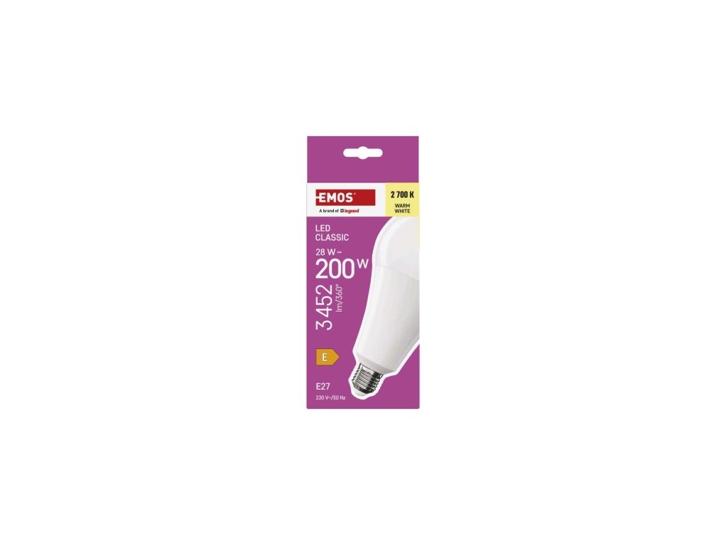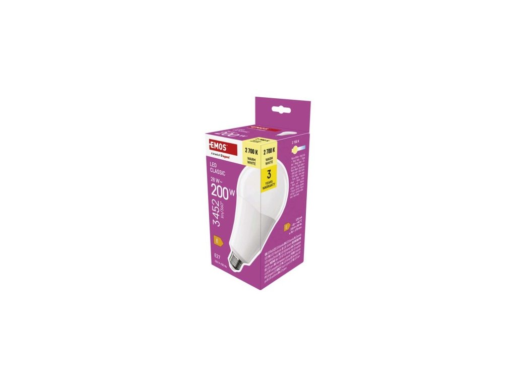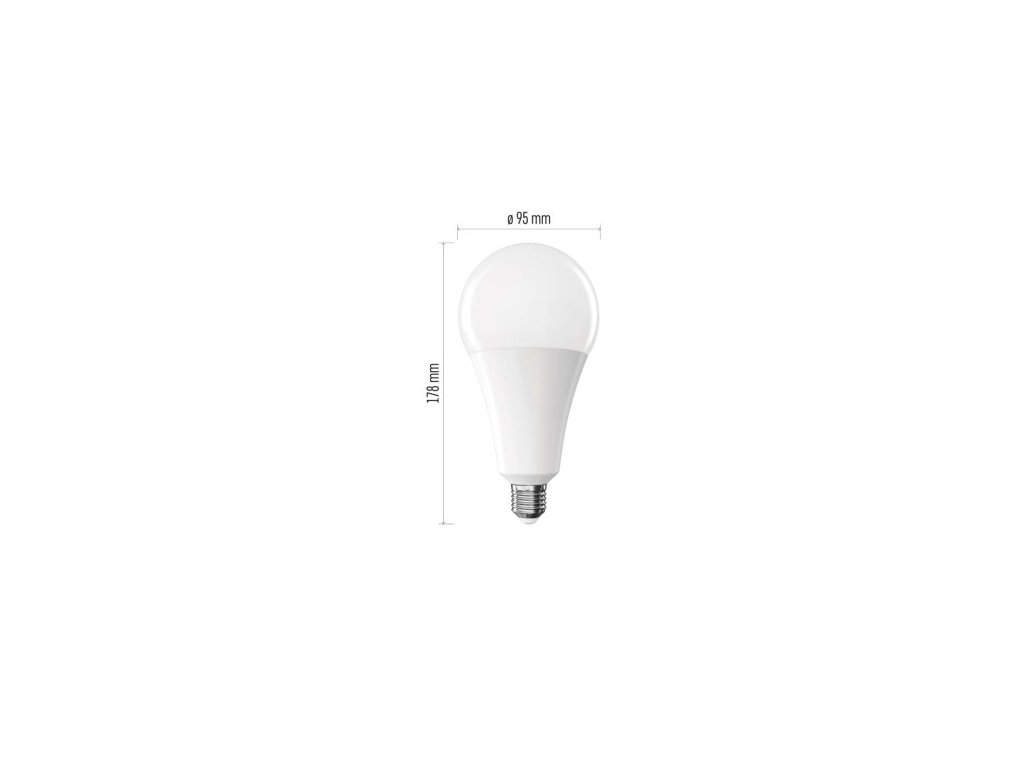 farba svetla: teplá biela|energetická trieda: E|index podania farieb (CRI): 80|kompatibilita: neuvádza sa|náhrada za žiarovku: 200 W|napätie: 230 V~/50 Hz|notifikácia do mobilnej aplikácie: neuvádza sa|ovládanie hlasovými asistentmi: neuvádza sa|pätica:| neuvádza sa|počet spínacích cyklov: 30 000|podporované OS: neuvádza sa|prenosová frekvencia: neuvádza sa|príkon: 28 W|predajný obal: 1 ks, krabička|protokol: neuvádza sa|rad: CLASSIC|rozmer: 95 × 95 × 95 × účinnosť: 123 lm/W|svetelný tok: 3 452 lm|technológia: LED|teplota chromatičnosti: 2 700 K|tvar: A95|typ čipov: SMD|účinník: 0,90|uhol vyžarovania: 180°|3 záručná doba: 0Dodatočné parametre