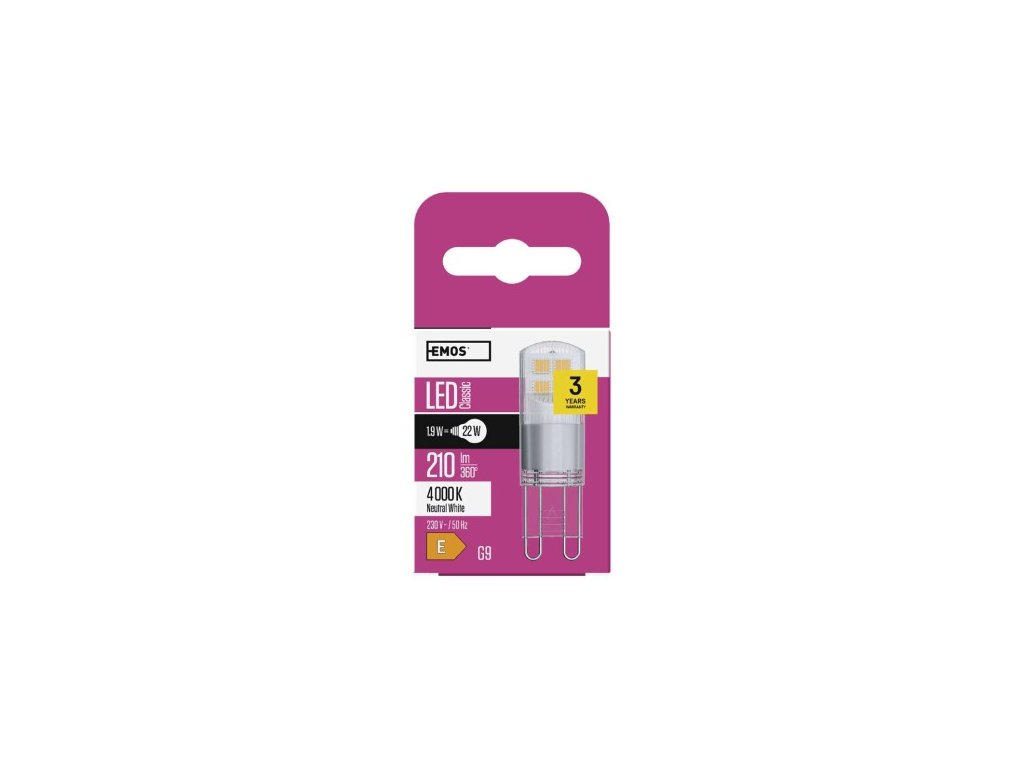 farba svetla: neutrálna biela|energetická trieda: E|index podania farieb (CRI): 80|kompatibilita: –|náhrada za žiarovku: 22 W|napätie: 230 V~/50 Hz|notifikácia do mobilnej aplikácie: –|ovládanie hlasovými asistentmi: –|pätica (uchytenie žiarovky): 25 000|podporované OS: –|prenosová frekvencia: –|príkon: 1,9 W|predajný obal: 1 ks, krabička|protokol: –|rad: CLASSIC|rozmer: 46 × 15 × 15 mm|stmievateľná: ne|svetelná účinnosť: 1 lm|technológia: LED|teplota chromatickosti: 4 000 K|tvar: JC|typ čipov: SMD|účnik: 0,537|uhol vyžarovania: 320°|záručná doba: 3 roky|životnosť: 30 000 hodínDodatočné parametre
