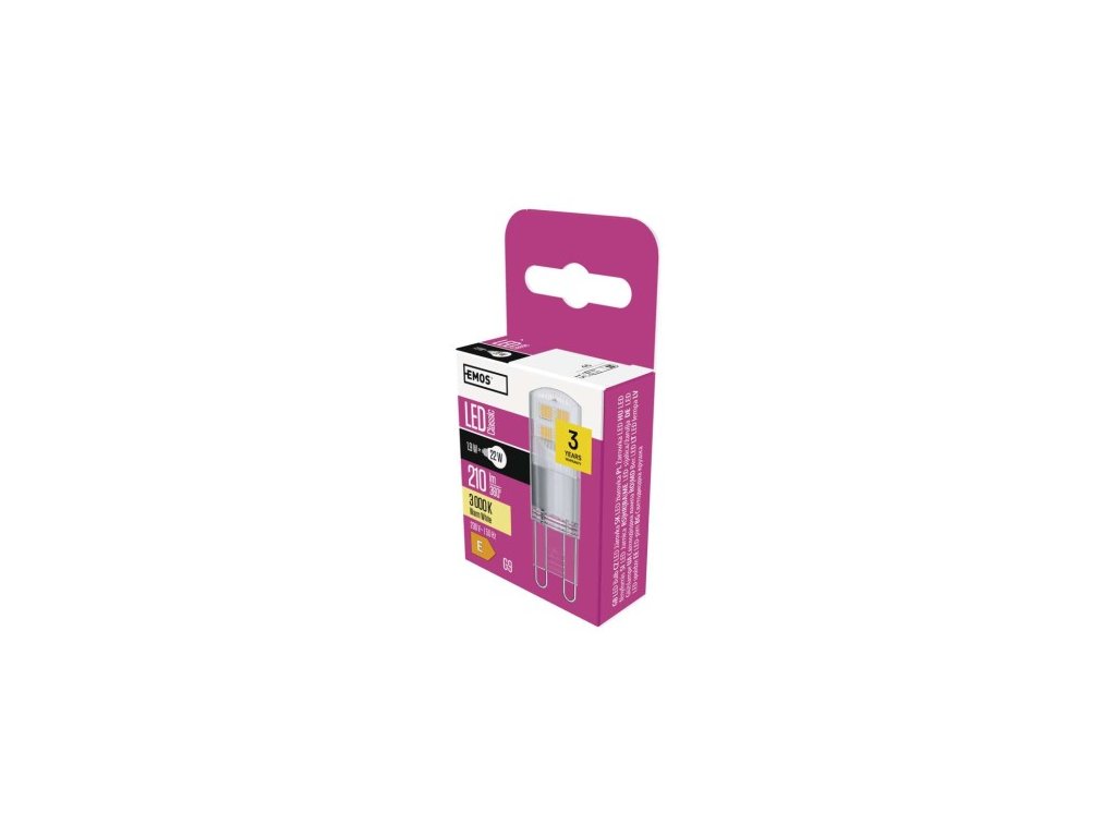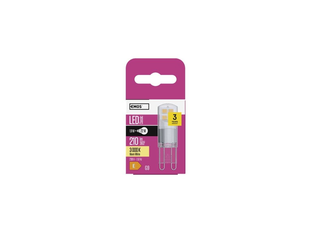 farba svetla: teplá biela|energetická trieda: E|index podania farieb (CRI): 80|kompatibilita: –|náhrada za žiarovku: 22 W|napätie: 230 V~/50 Hz|notifikácia do mobilnej aplikácie: –|ovládanie hlasovými asistentmi: –|pätica (uchytenie žiarovky): G: 25 000|podporované OS: –|prenosová frekvencia: –|príkon: 1,9 W|predajný obal: 1 ks, krabička|protokol: –|rad: CLASSIC|rozmer: 46 × 15 × 15 mm|stmievateľná: ne|svetelná účinnosť: 1 lm|technológia: LED|teplota chromatickosti: 3 000 K|tvar: JC|typ čipov: SMD|účnik: 0,442|uhol vyžarovania: 320°|záručná doba: 3 roky|životnosť: 30 000 hodínDodatočné parametre