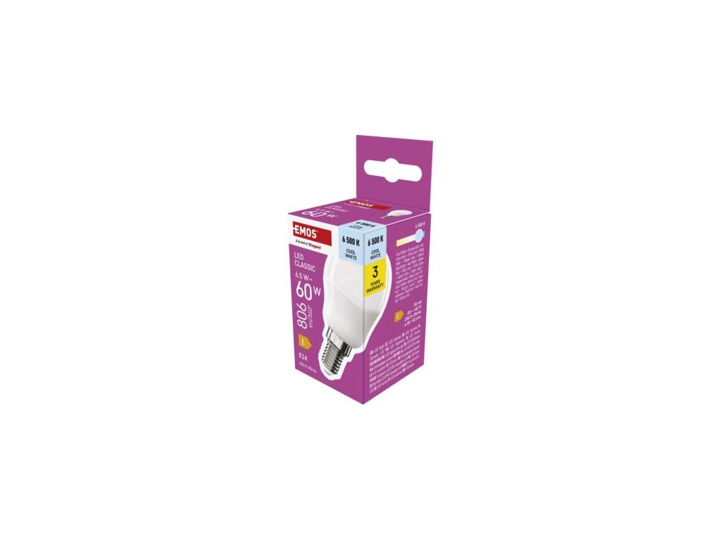 farba svetla: studená biela|energetická trieda: E|index podania farieb (CRI): 80|kompatibilita: –|náhrada za žiarovku: 60 W|napätie: 230 V~/50 Hz|notifikácia do mobilnej aplikácie: ne|ovládanie hlasovými asistentmi: ne|pätica (uchytenie žiarovky): E1 cyklov: 30 000|podporované OS: –|prenosová frekvencia: –|príkon: 6,5 W|predajný obal: 1 ks, krabička|protokol: –|rad: CLASSIC|rozmer: 45 × 45 × 82 mm|stmievateľná: ne|svetelná 806 lm|technológia: LED|teplota chromatickosti: 6 500 K|tvar: Mini Globe|typ čipov: SMD|účnik: 0,50|uhol vyžarovania: 150°|záručná doba: 3 roky|životnosť: 30 000 hodínDodatočné parametre