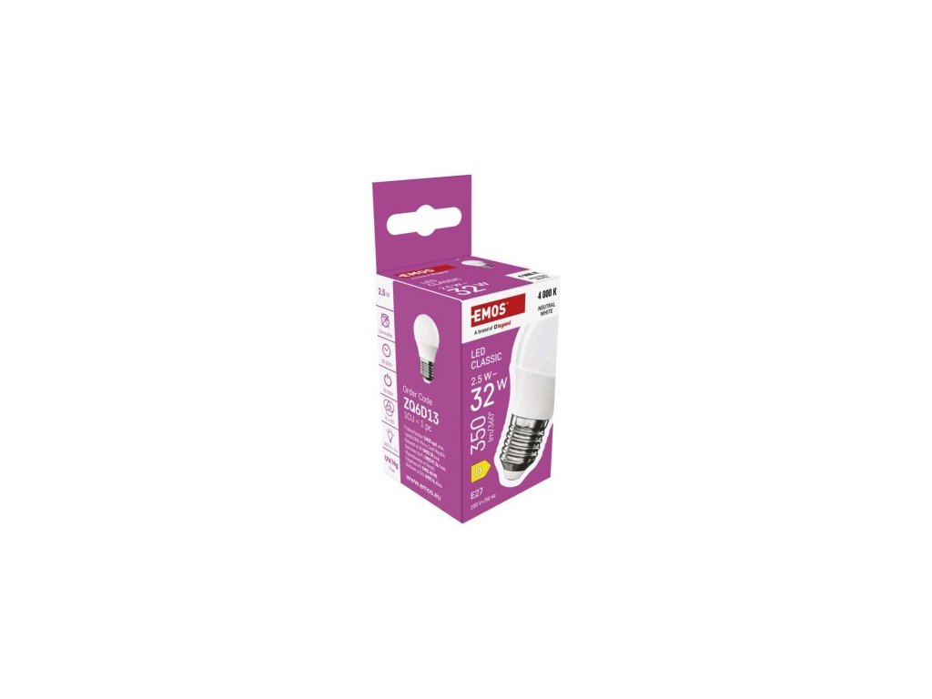 farba svetla: neutrálna biela|energetická trieda: D|index podania farieb (CRI): 80|kompatibilita: –|náhrada za žiarovku: 32 W|napätie: 230 V~/50 Hz|notifikácia do mobilnej aplikácie: ne|ovládanie hlasovými asistentmi: ne|pätica (uchytenie žiarovky): cyklov: 30 000|podporované OS: –|prenosová frekvencia: –|príkon: 2,5 W|predajný obal: 1 ks, krabička|protokol: –|rad: CLASSIC|rozmer: 45 × 45 × 77 mm|stmievateľná: ne|sveteľná: ne|svetelná 350 lm|technológia: LED|teplota chromatickosti: 4 000 K|tvar: Mini Globe|typ čipov: SMD|účinník: 0,50|uhol vyžarovania: 150°|záručná doba: 3 roky|životnosť: 30 000 hodínDodatočné parametre