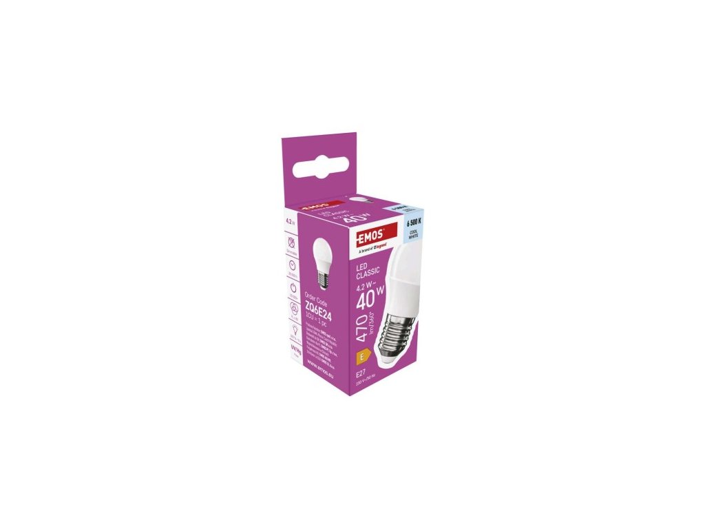 farba svetla: studená biela|energetická trieda: E|index podania farieb (CRI): 80|kompatibilita: –|náhrada za žiarovku: 40 W|napätie: 230 V~/50 Hz|notifikácia do mobilnej aplikácie: ne|ovládanie hlasovými asistentmi: ne|pätice (uchytenie žiarovky): E2 cyklov: 30 000|podporované OS: –|prenosová frekvencia: –|príkon: 4,2 W|predajný obal: 1 ks, krabička|protokol: –|rad: CLASSIC|rozmer: 45 × 45 × 77 mm|stmievateľná: ne|svetelná| 470 lm|technológia: LED|teplota chromatickosti: 6 500 K|tvar: Mini Globe|typ čipov: SMD|účnik: 0,50|uhol vyžarovania: 150°|záručná doba: 3 roky|životnosť: 30 000 hodínDodatočné parametre